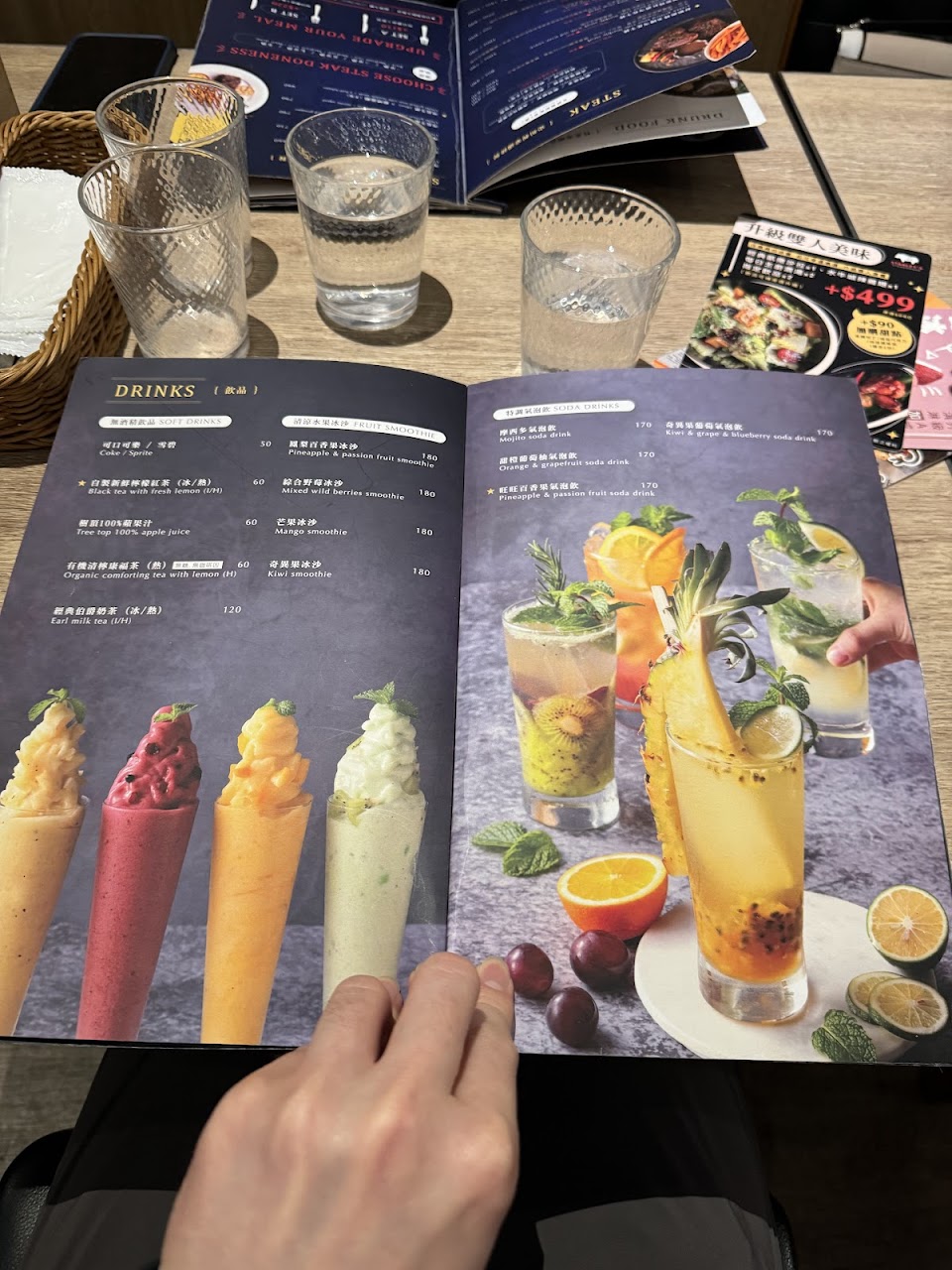 餐點主要以美國牛排、海陸雙拼或漢堡類為主,可加購升級成A、B兩種套餐,B套餐多一份甜點,個人覺得牛排肉質與鮮度都完美呈現,美味厚切,份量足夠,每人一份主餐,大夥分食,氣氛十足融洽