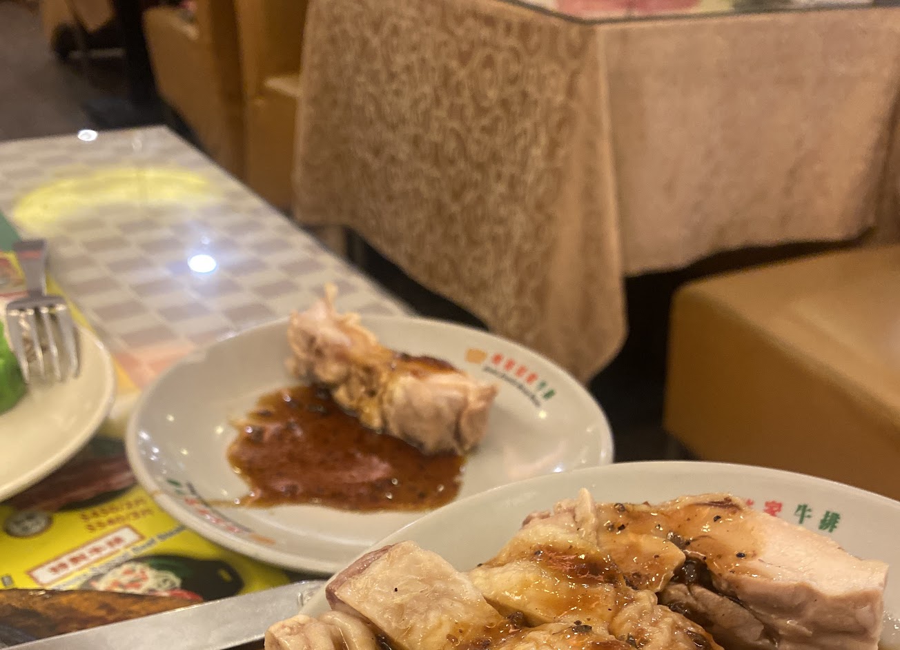 吃得是兒時的回憶(雖然味道完全跑掉…) 沙朗牛排筋多且超乾柴,各種卡牙縫… 連最安全牌的甜點爆米花都受潮潤潤… 坐在店裡看著吧台完全沒有吸引的餐點… 坦白說要吃牛排的話隔壁的比較好吃?