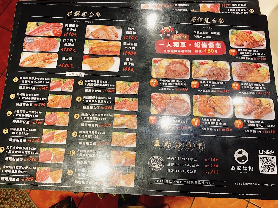 記憶中我家牛排算是平價牛排,沒想到這次進來,著實嚇了一跳,價格幾乎都四百以上,每個人都有低消,9~12歲低消可選擇沙拉吧190元,價格需再加上10%服務費。