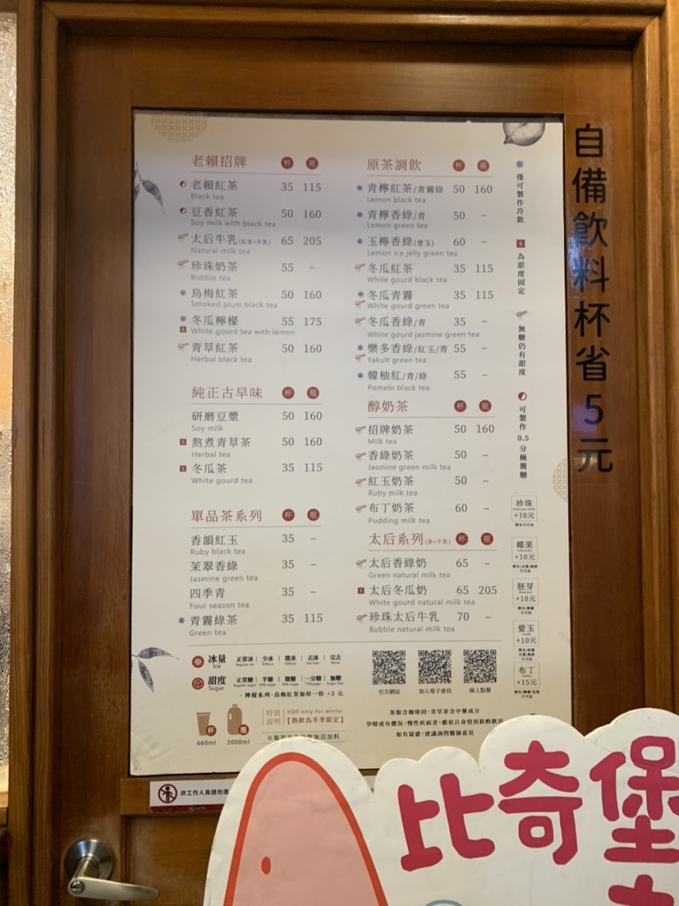 推:豆香紅茶(經典口味 香醇)、韓柚紅玉(清爽酸甜)、太后香綠奶+茶凍(蠻順口的 茶凍很香 有提升口感)