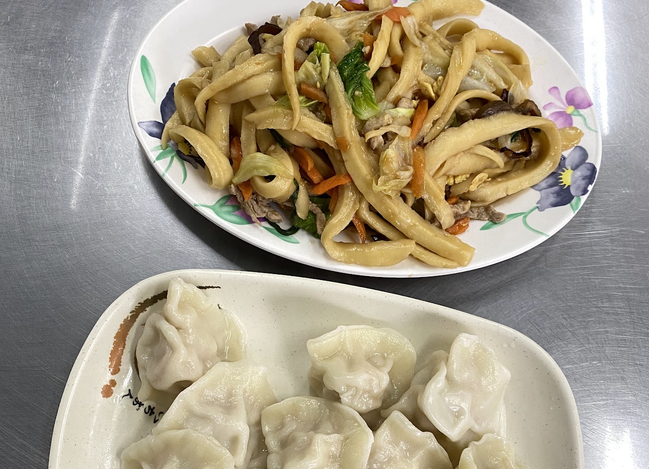 用餐時間真的是人山人海…還好店內品項不多…店員也都蠻熟門熟路的…其實點完餐找到座位…等了15分鐘左右餐點就上齊了…招牌木須炒麵確實不錯吃…刀削麵咬勁口感十足…醬油香味四溢…但配料幾乎看不見肉絲…基本配料紅蘿蔔絲、木耳絲、炒蛋、小白菜也算不多(最多的是紅蘿蔔絲)…其實無論是味道或份量…都曾吃過不輸本店的木須炒麵(而且配料有韭黃)…個人是不覺得值得大排長龍來吃…酸辣湯餃就弱了點…酸辣湯跟木須炒麵基本一樣的配料…不怎麼酸辣…水餃味道尚可…但外皮軟爛…口感不佳…不過本店生意雖好客人雖多…但服務態度仍然相當不錯…在傳統小吃店裡…算是相當難得的…+0.5