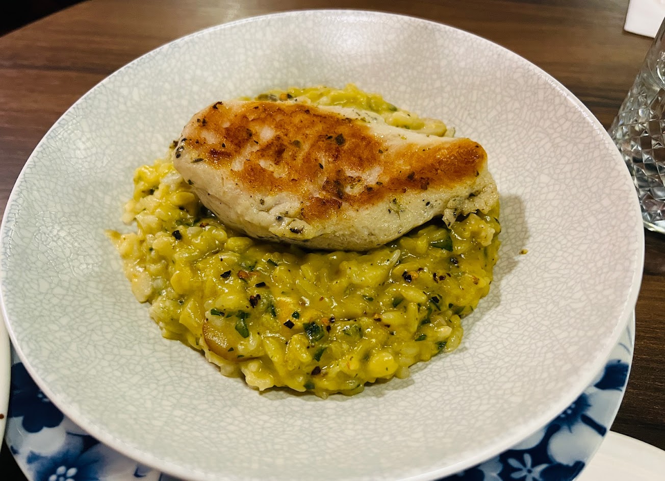 先上來的是番茄羅勒起士沙拉,番茄起士搭著新鮮的羅勒,真的很好吃,那天的湯品是洋蔥濃湯,還不錯,只是稍感鹹了點,等了好一會兒,主餐燉飯上桌了,燉飯是有米心的,但很順口,有點微辣,但是是好吃有入味的,雞胸肉煎過表面有點焦脆,不錯吃,不會柴,雖然端上時賣相不太佳,我這人對餐飲的色香味比較挑惕,但整體的餐吃得出來主廚的用心,很少吃完義式料理有飽足感,但這餐有飽足,雞胸肉還因為太飽了沒吃完,對主廚深感抱歉