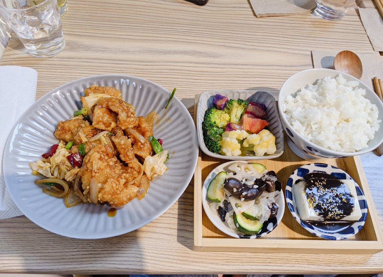 有用豆漿做的手工豆腐、涼拌花椰菜、蓮藕、木耳…等等,吃起來都很有水準不會有被坑錢的感覺