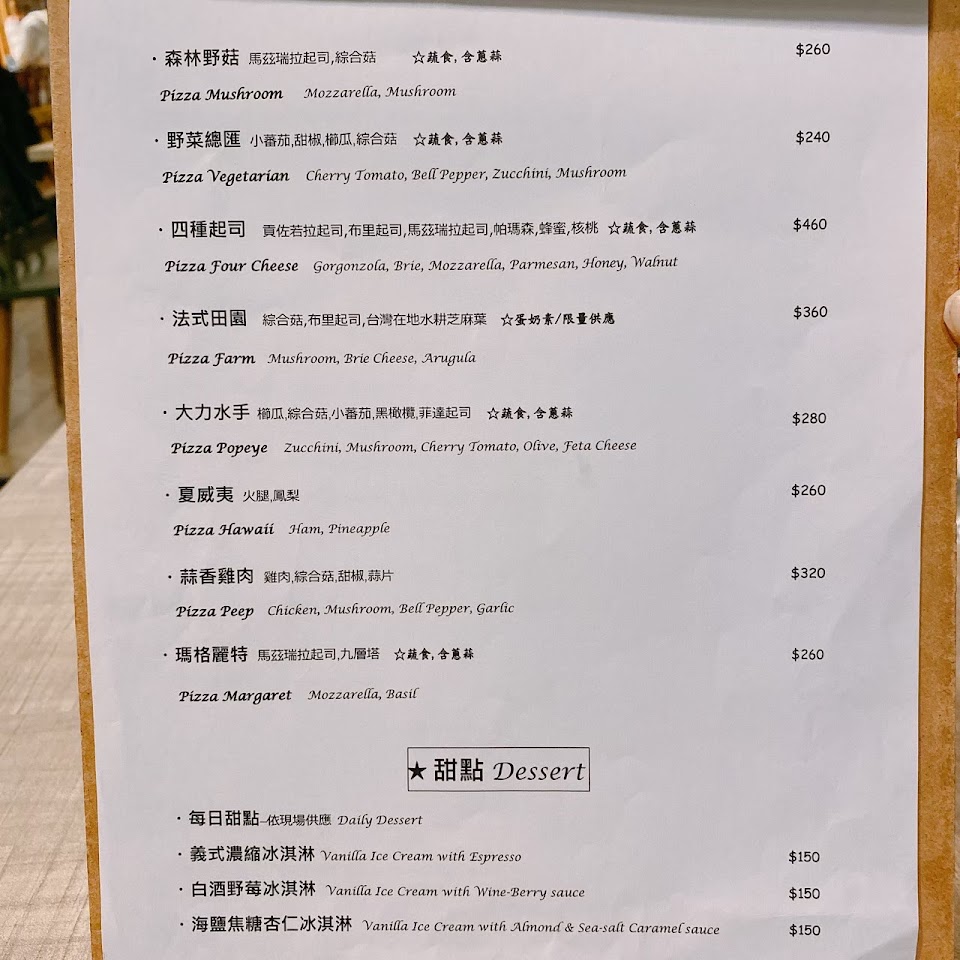 Pizza很好吃 店家氣氛也很棒 有放鬆的fu 服務 內用 餐點類型 午餐 平均每人消費金額 $400-600 餐點:5 服務:4 氣氛:4