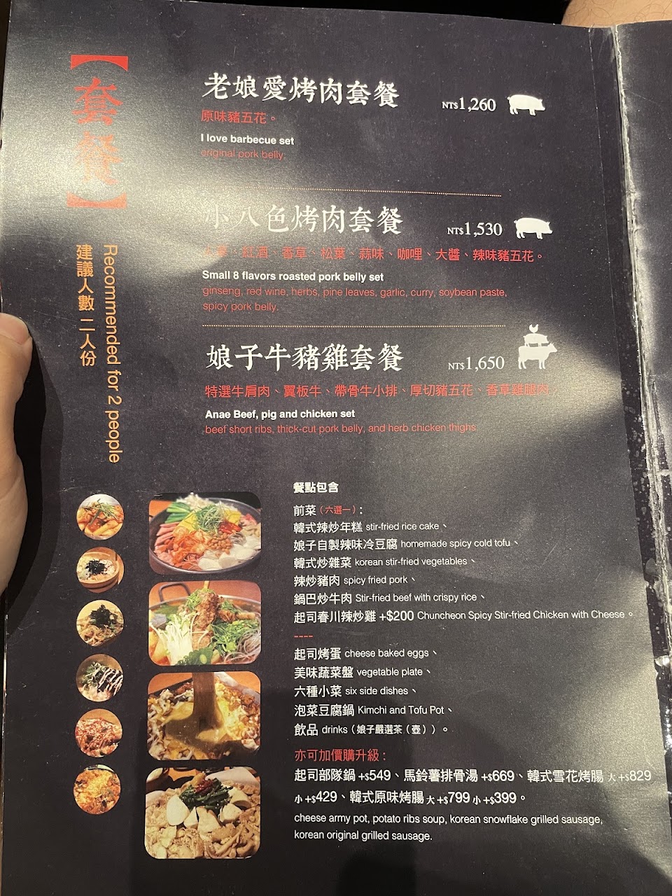 低消一份肉類套餐,但如果想吃炸雞或煎餅都要另外點 建議三四個人來點小份套餐再加點其他想吃的,不然通常吃不完 店員親切好聊,會解說菜色並在桌邊幫你把主餐烤好;店內氣氛不錯適合三五好友聚會聊天,因為第六個就會有點擠了。