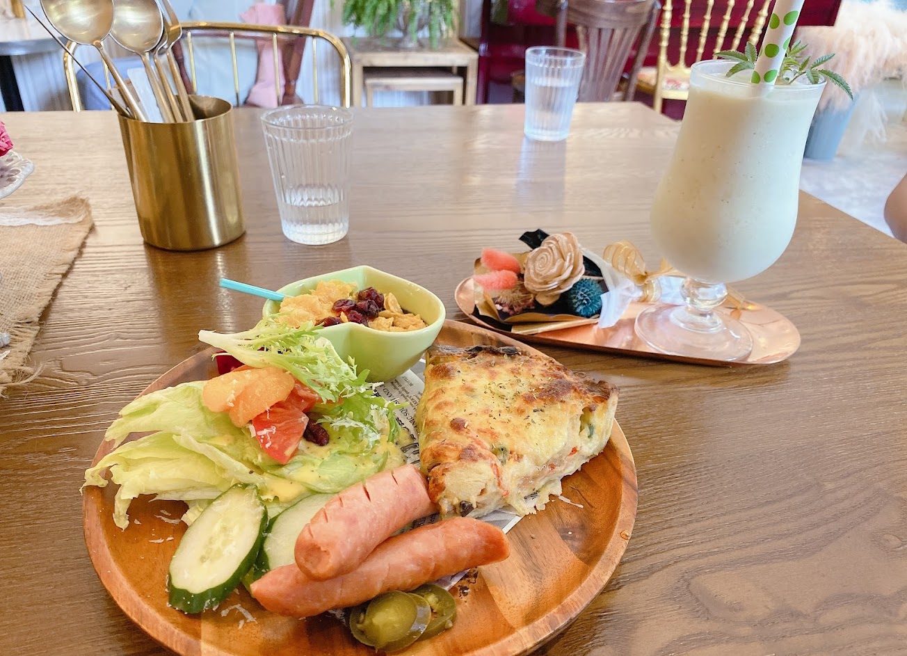 本來想坐在室內,因為室內真的很漂亮,但是人太多ㄌ,改成室外,不錯天氣宜人,餐點的部分也花點小巧思給要拍照的我們,飲品都有提供乾燥花為拍照增加一點美感,這家店有提供高蛋白餐還有低糖餐,非常適合健身跟減糖ㄉ人選擇,但是甜點的部分就還好,因為想吃的都沒了,只能點普通的檸檬派,服務員態度佳,整體滿推