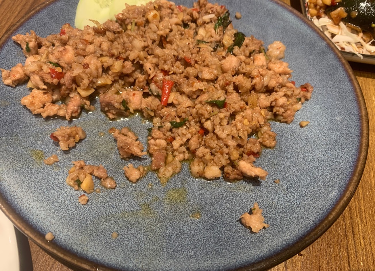 第二道是金錢蝦餅剛好六塊, 炸得很好, 裡面很Q彈也吃得道蝦子本人, 行裝不是一般外面看道的圓型, 是中間有空洞的比較像甜甜圈。第三道是打拋豬, 點餐時店員有再三交代很辣, 來了之後吃真的很辣, 上菜時店員有介紹可以先吃原味, 之後可以再加上附的檸檬魚露和小黃瓜片一起吃, 生辣椒感很重但會讓人一直想吃, 配上檸檬魚露和小黃光會解膩解辣, 還可以續。