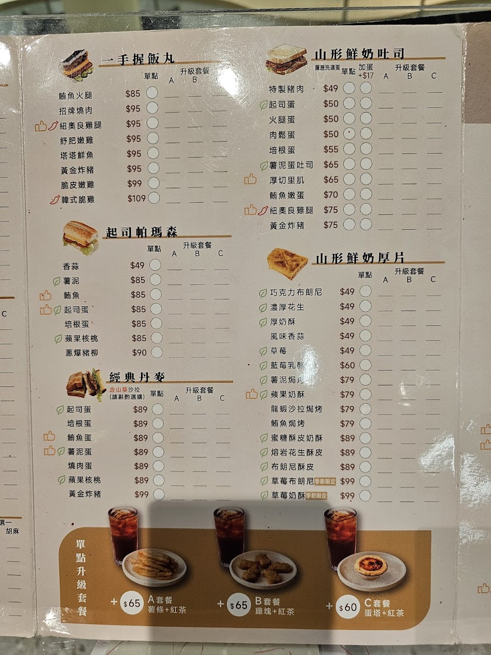 今天點到的都沒雷,超好吃? ?雙層起司蛋餅是起司片加乳酪司 鮮奶厚片花生很濃,醬很多,但要$49偏貴 薯條記得去醬料區擠蜂蜜芥末好讚! 還順道把蜂蜜芥末擠進漢堡內,好吃度提升 漢堡皮本身很香,偏紮實不會一拿就扁掉 特製豬肉像一般美而美那種壓扁的漢堡肉,口感偏肥 餐點:5 服務:5 氣氛:5