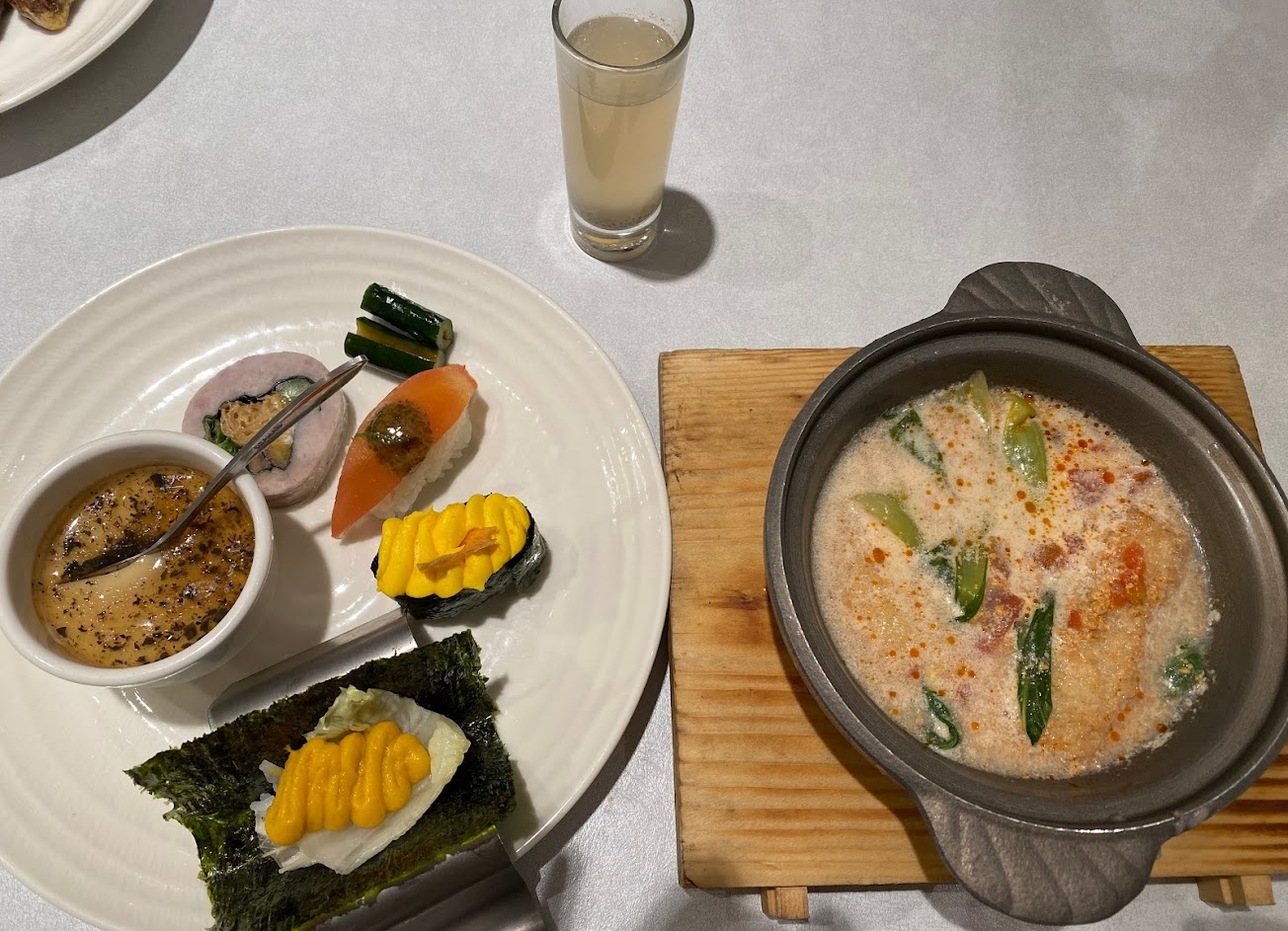 ? 湯品佛跳牆料很多,關東煮的湯好好喝。 ***** 2022/3/3下午茶 第五次來,累積兩次晚餐、三次下午茶。今天發現最近新推出的下午茶限定[海味鮮Q握壽司]有喜歡的椰子肉,上綴南瓜泥乳酪。之前吃過素海膽手捲,今天第一次拿香菇杏鮑菇手卷,也很好吃。笑著跟師傅說:「來五次,還是有沒吃過的。」即使吃過的,一週吃一次也不膩。能在這麼優雅環境用餐,真的很享受。