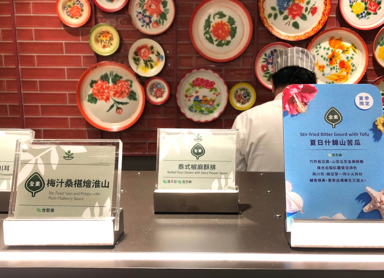 素食種類的標示很清楚,例如蛋奶素、全素…等,餐點也很精緻創新,拔絲地瓜和梅汁桑葚燴淮山必拿,非素食者也會很驚豔