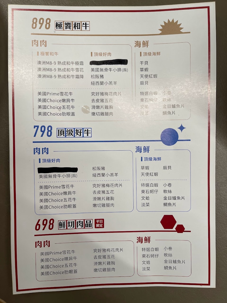 火鍋有依肉品種類分不同價位,價錢差100的話其實滿建議都直上和牛,因為和牛真的非常好吃。