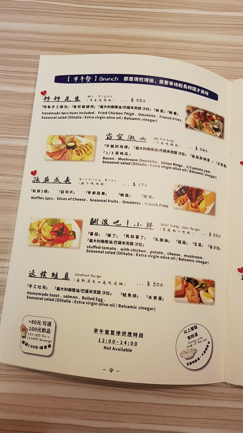 餐廳空間不大,但很溫馨、安靜,特別喜歡每桌都有一桶玻璃瓶裝水。選擇早午餐系列的餐點(下午也有供應,只有午餐時間停供),餐點名稱很有趣,「好好先生」份量大,麵包、沙拉、歐姆蛋、薯條、還有雞腿排,適合食量大的人;「翻滾吧!小胖」專為注重身材者設計,有雞胸、地瓜、多種蔬菜,熱量剛好,營養不打折;早午餐系列還有窈窕淑女、返璞鮭真,提供不同的選擇。