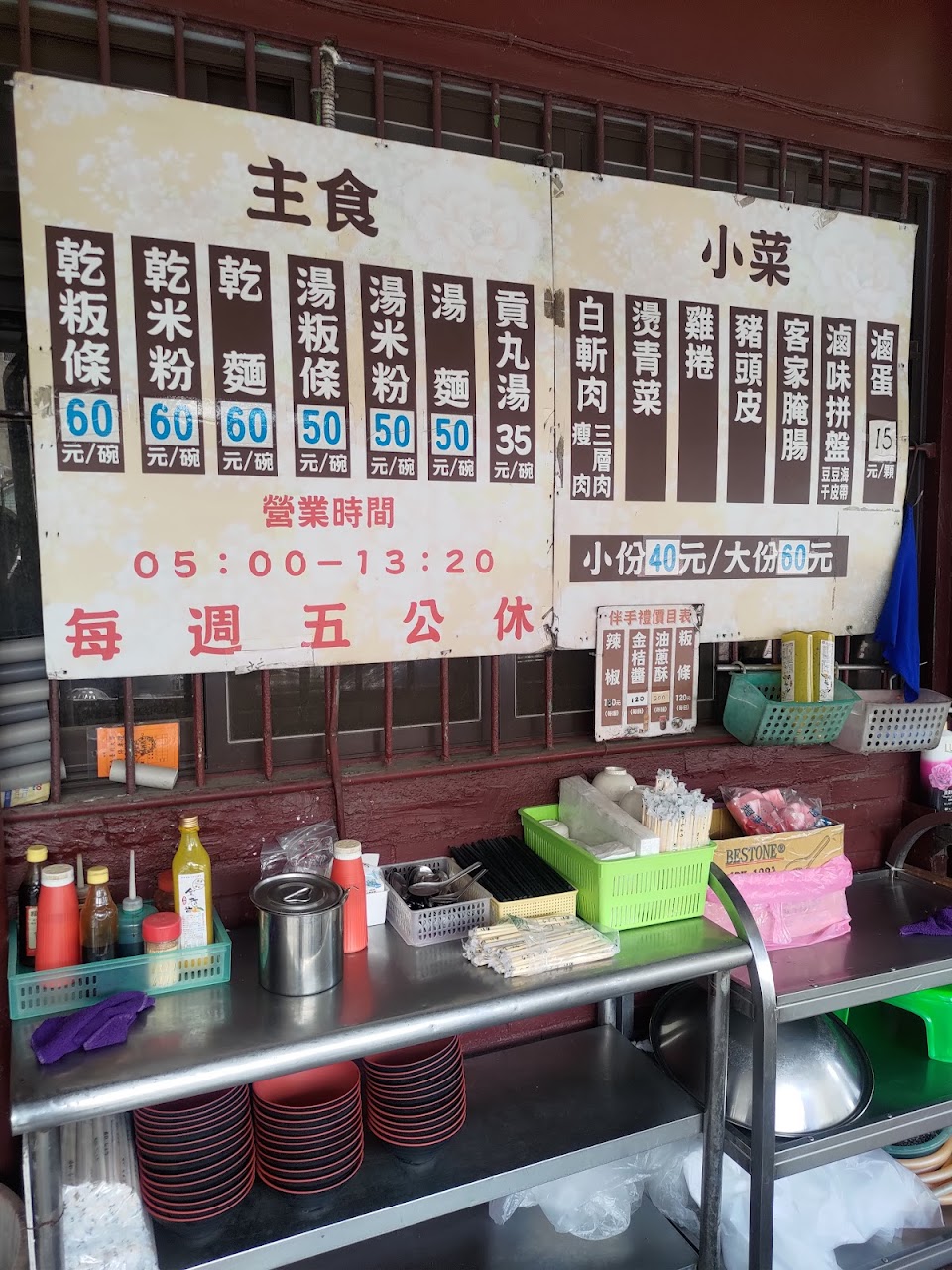 沾醬, 湯板條 五花肉, 乾板條 貢丸湯, 湯米粉加滷蛋, 雞捲 粉腸 貢丸湯 板條