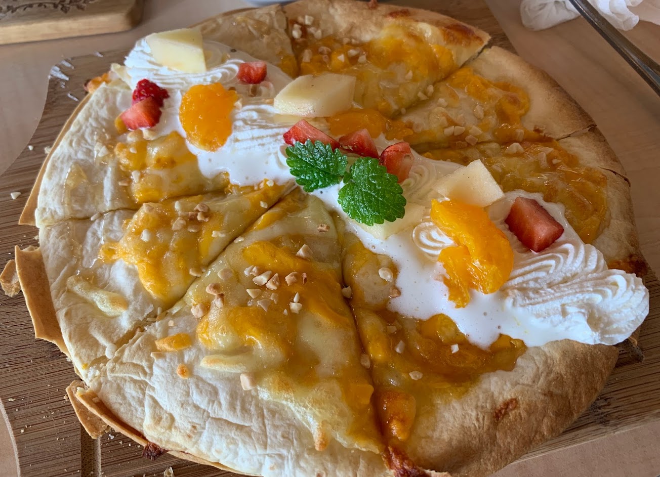 濃湯的料很多很滿足,食材上不用擔心一定新鮮,蝦子口感很好很Q,但是要能接受稍生的部分,去腥也做的不錯。麵包的蘋果醬搭配自製奶油,爽口且清香。pizza是彩椒牛肉起司口味,剛上來就可以聞到一股彩椒與烤餅味,蠻誘人的。餐後甜點是自製紅豆豆花,一點都不死甜。