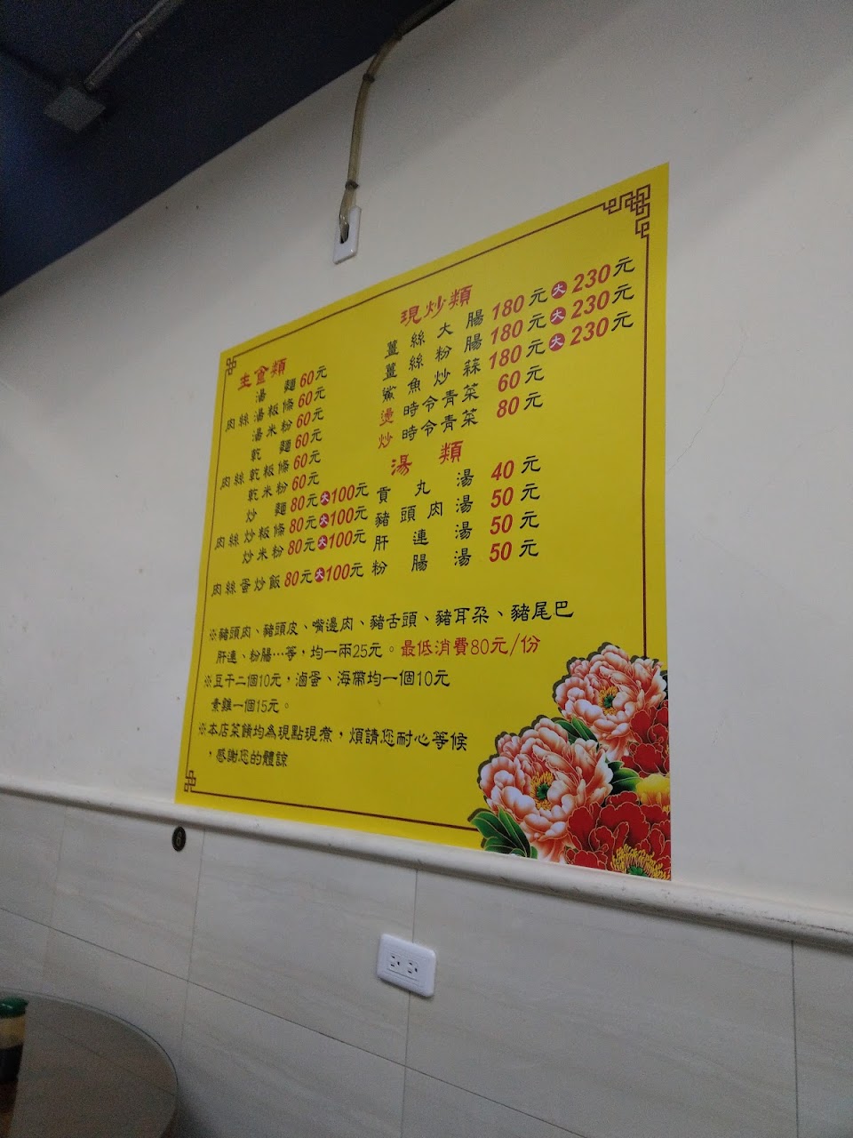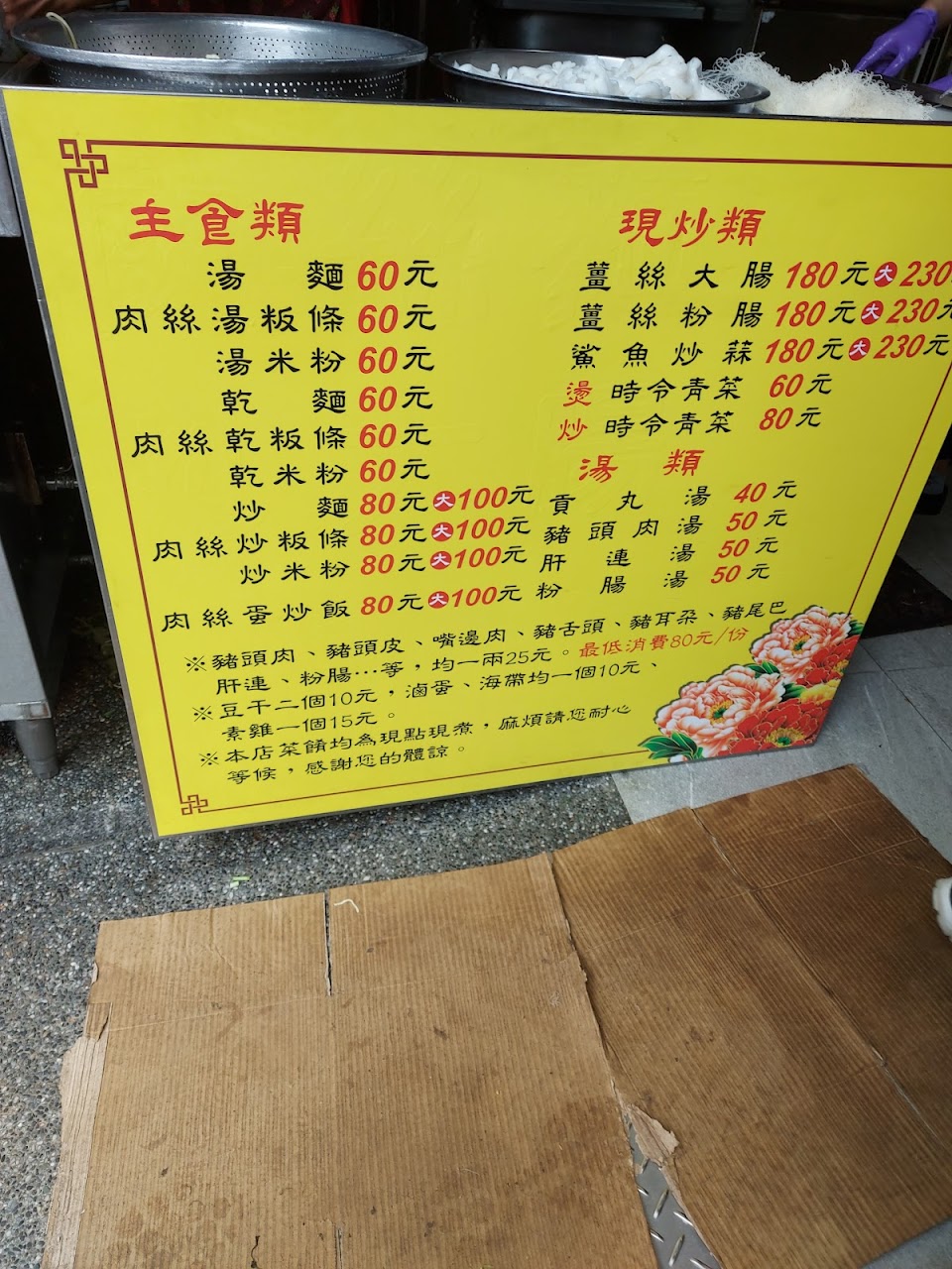 用餐環境中下,小菜餐盤都濕濕的,衛生面堪憂,肉絲板條$60份量大但肉絲很老,豬頭肉還不錯吃