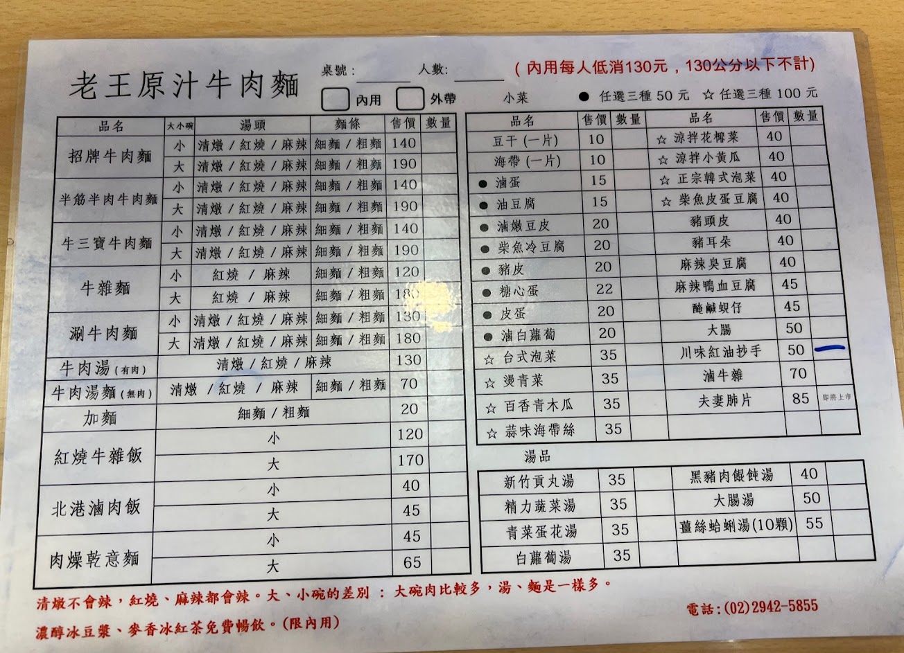 缺點: 1. 遠傳在靠裡面的位置訊號不太好 2. 兩次來老王,筷子感覺都油油的(不知道是不是我拿錯,拿到其他客人回收還沒洗的??) 3. 小菜普通,主要都是醬油的味道 服務 內用 餐點類型 晚餐 平均每人消費金額 $1-200