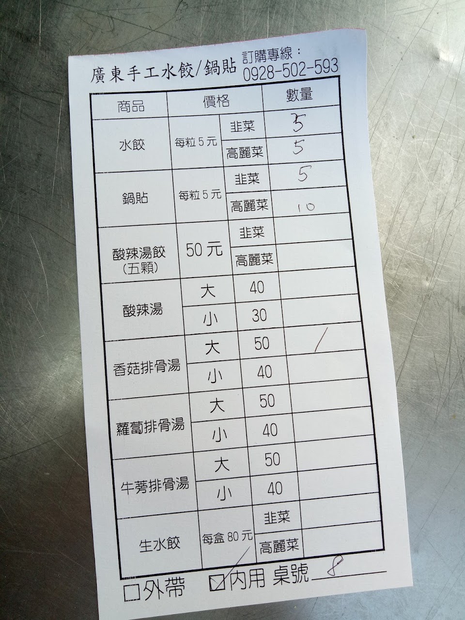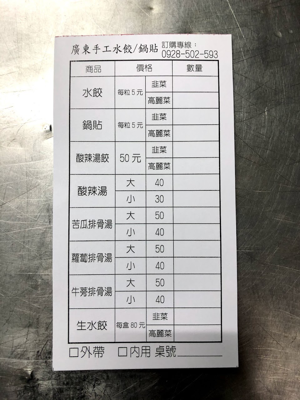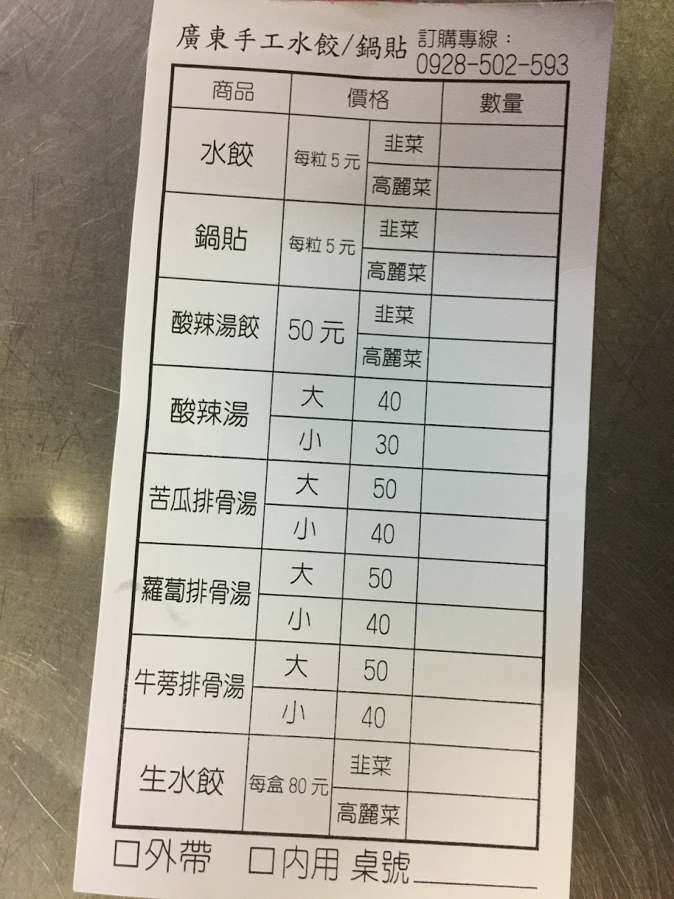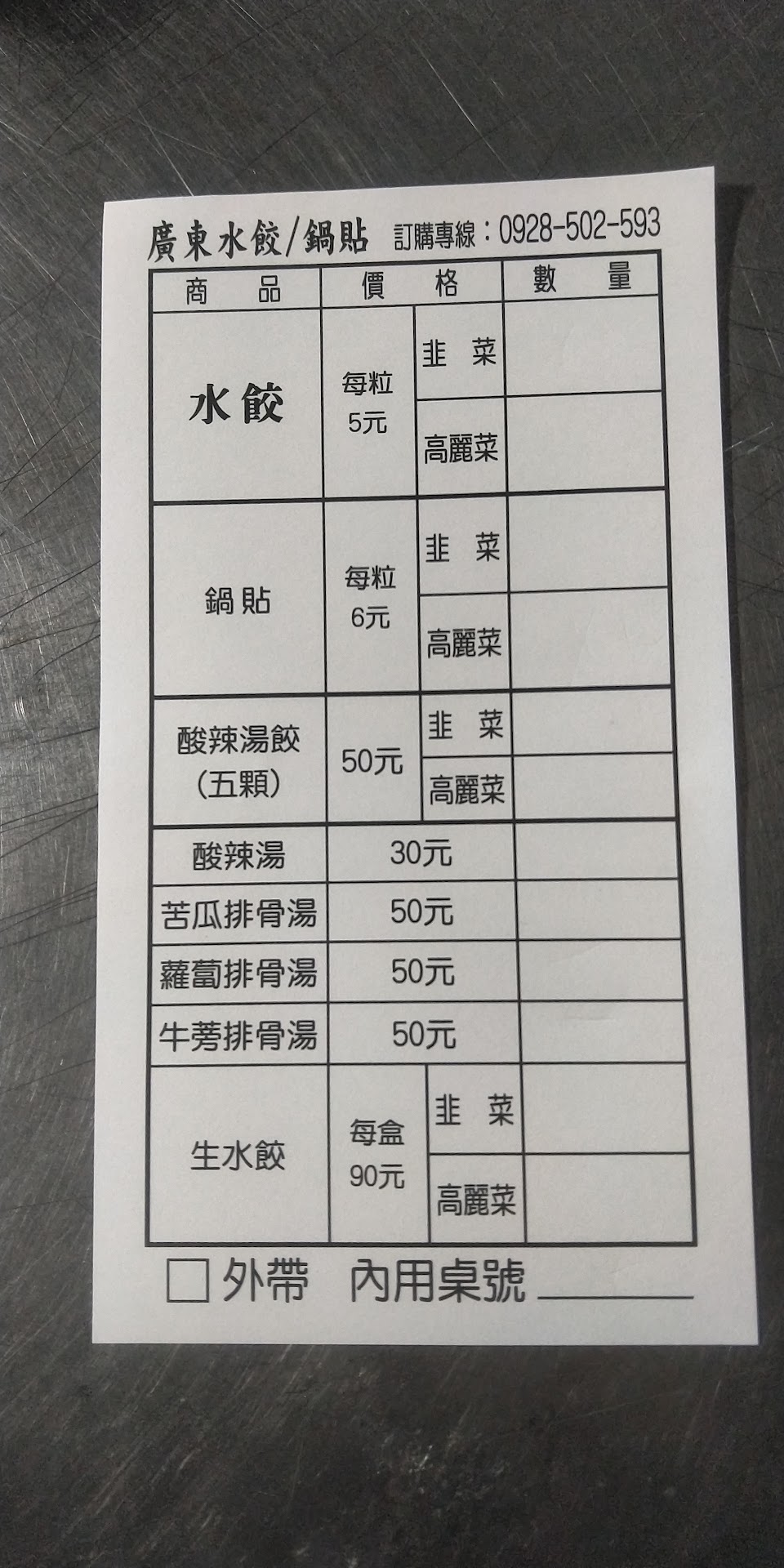 普羅大眾化的銅板美食水餃&鍋貼,內餡只有“高麗菜豬肉”&韭菜豬肉兩種,價格水餃每顆5元,鍋貼每顆6元。