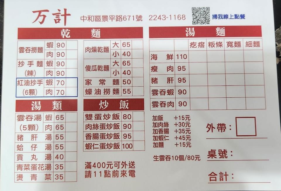 2024最新在地推薦餐廳的菜單_萬計撈麵 景平店的菜單、圖片