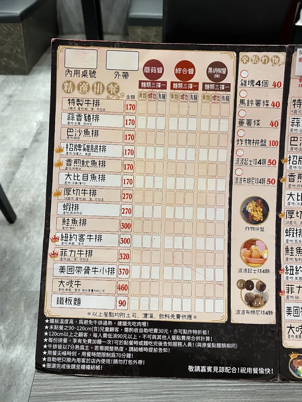 主餐外送價格和內用相同,差在副餐(副餐在外送中都要額外加價、品項也沒有內用選項多)