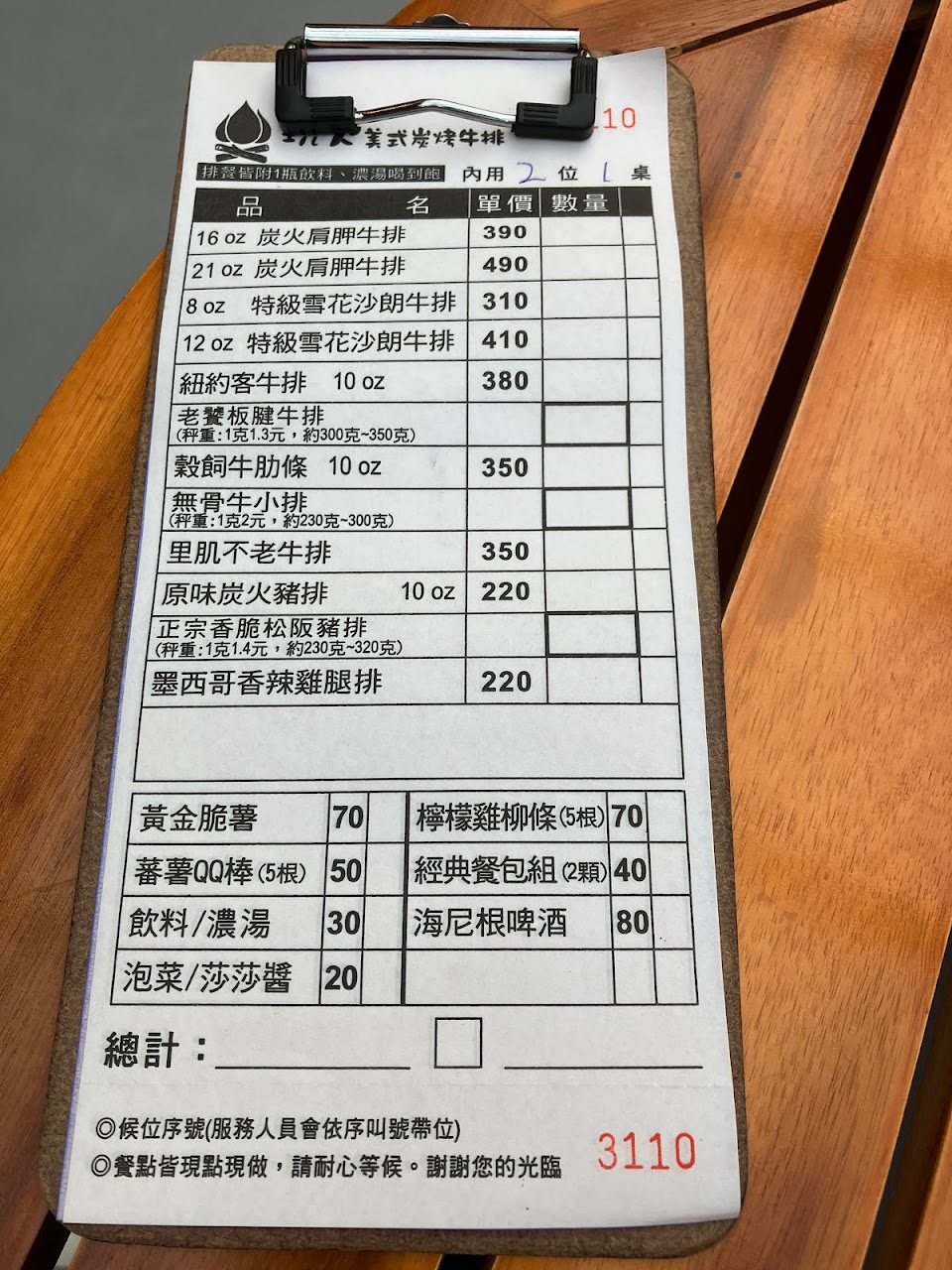 情人節老公帶我和女兒一起來吃,臨時決定6點半現場排隊到7點20入場,有停車場,廁所在餐廳外面。我們點松阪豬和老饕牛、脆薯和QQ棒、餐包。點排餐濃湯免費續、飲料1罐,整體來說還不錯?