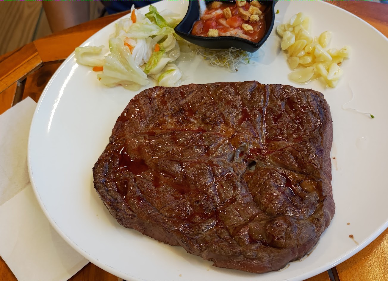 餐點:說真的滿難吃的,為什麼美式炭烤牛排會配泡菜和超濕的蒜頭?然後莎莎醬也很莫名其妙,是要沾什麼東西?