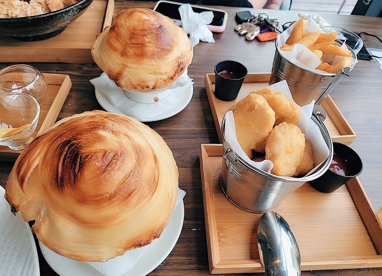 餐點部分第一次來點兩套單人套餐,套餐有濃湯,麵包,炸物拼盤,主餐和飲品,甜點泡芙;燉飯部分口感帶點米心感,但不錯吃,披薩比起來顯得比較弱,泡芙內餡像冰淇淋,冬天吃真的好冰~