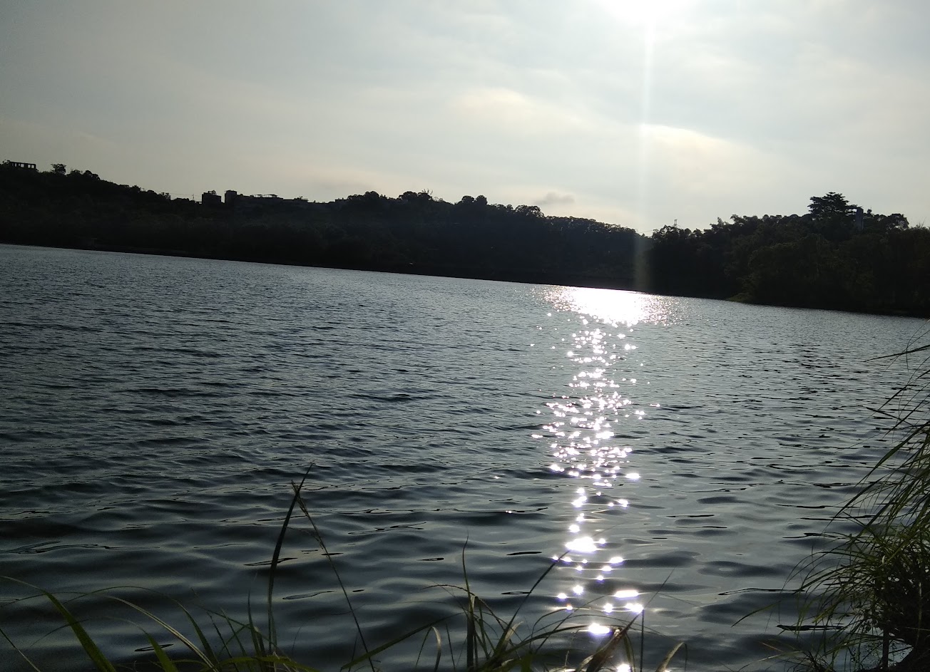 沿著寶山水庫步行,波光粼粼,樹梢傳來鳥鳴,橘紅豔麗的夕光映照水面,真特麼的如畫美景….。