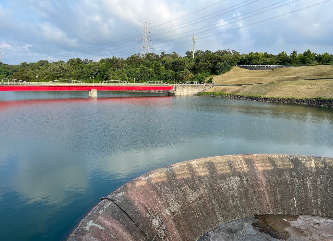 近期拜梅雨鋒面雨水之賜,讓水庫喝飽了水,目前接近滿水位,在大約1公尺多就可以溢流,美麗的湖面風光,涼涼的風,再加上完善的管理,是值得來散散步的地方~:)