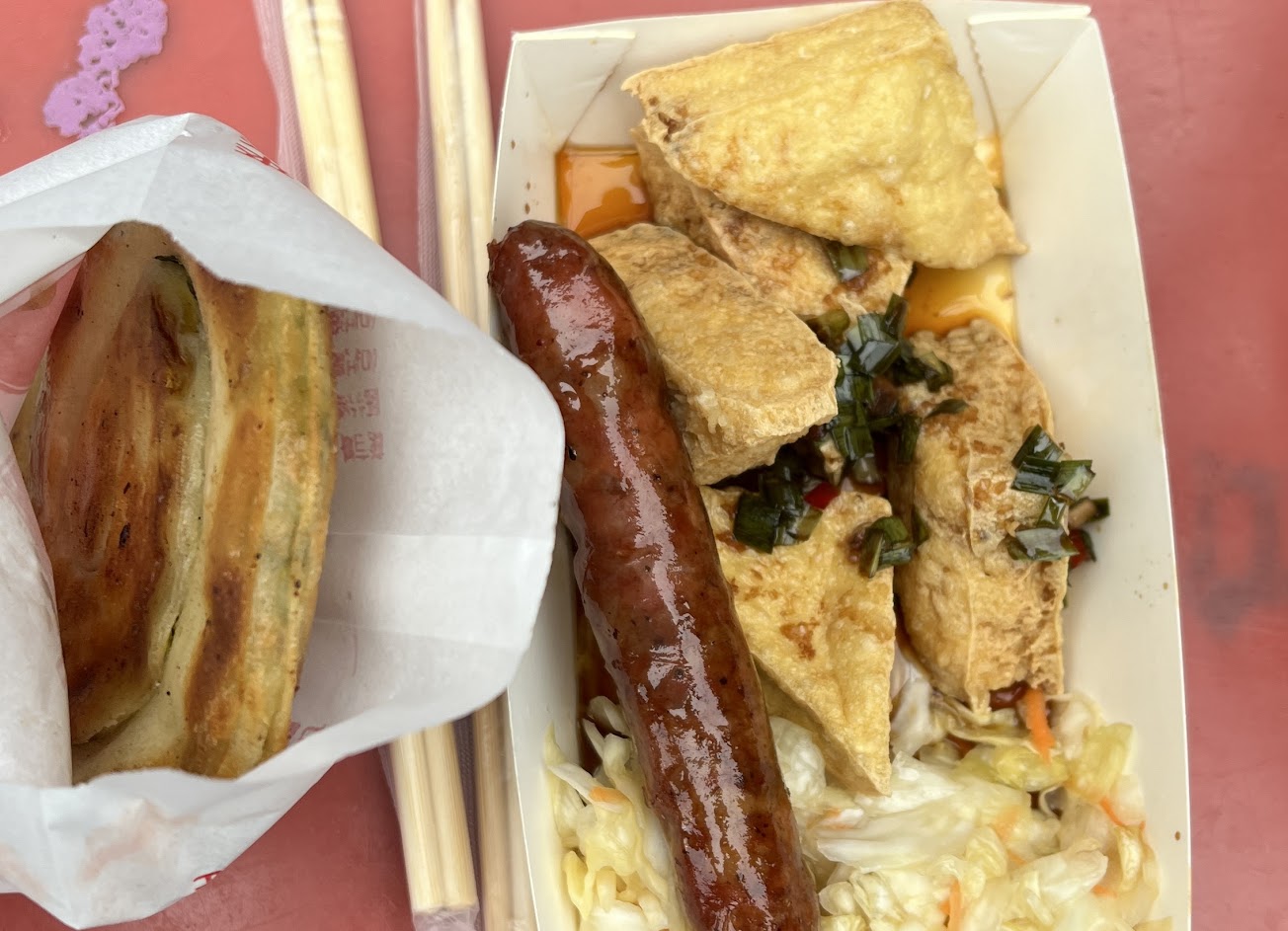 豆腐有臭,外酥內軟,香腸是脆皮的,紅藜甜甜圈蠻特別的
