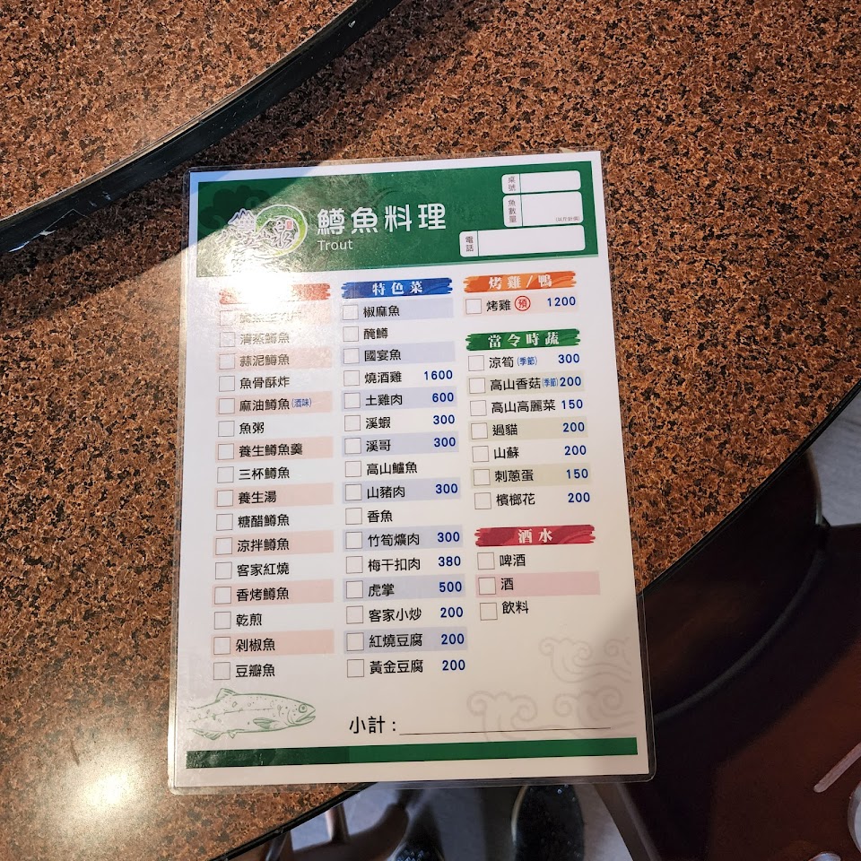 環境不錯,很安靜的小地方。老闆跟廚房裡都是有點年紀的人,但手腳好快,現殺的魚一下子就上桌了,乾淨的泉水養出的鱒魚Q彈有勁,一魚三吃超高CO值 服務 內用 餐點類型 午餐 平均每人消費金額 $400-600 建議的餐點 現殺鱒魚, 紅燒鱒魚