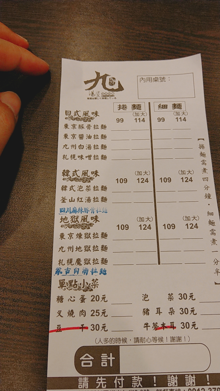 漲價但是菜單沒改,只在櫃檯用立牌公告,便宜行事。麵的品質和形象沒有保持水準,這間九湯屋是目前吃到最不像九湯屋的九湯屋,就是能填飽肚子的一碗麵而已。