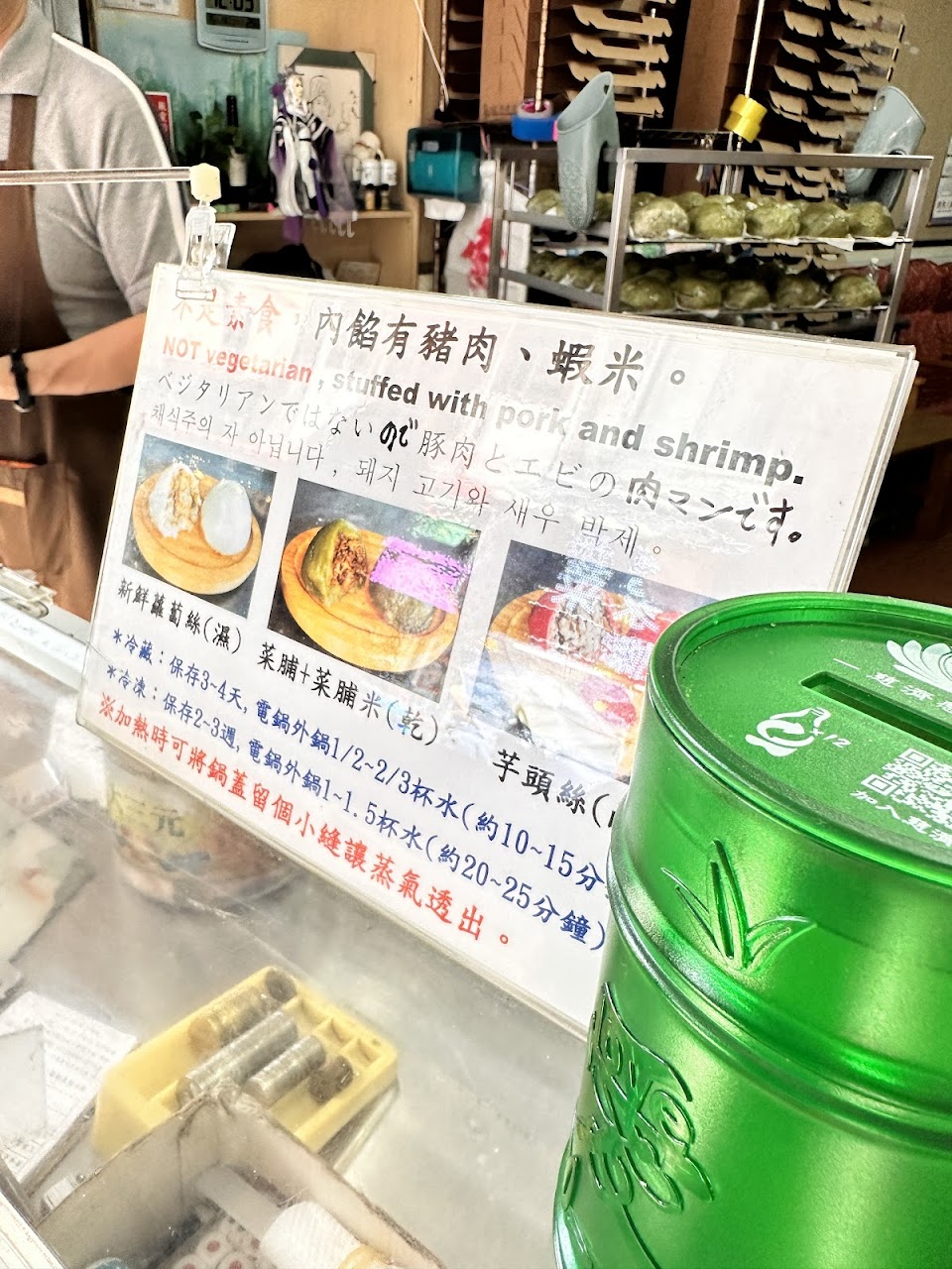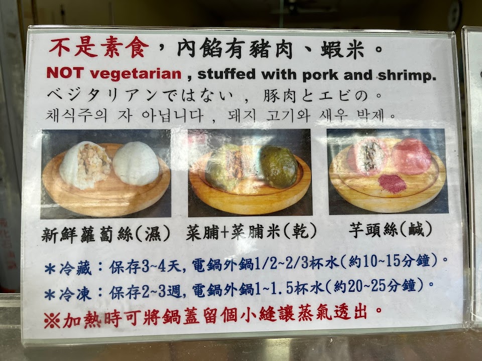上回來還沒蒸好 這回十二點來 又下雨天 終於什麼都有 買了紅的芋頭綠的菜脯米 個頭大 兩個管我飽 調味清淡 不是傳統粉油粉鹹粉香那種 有點小失望