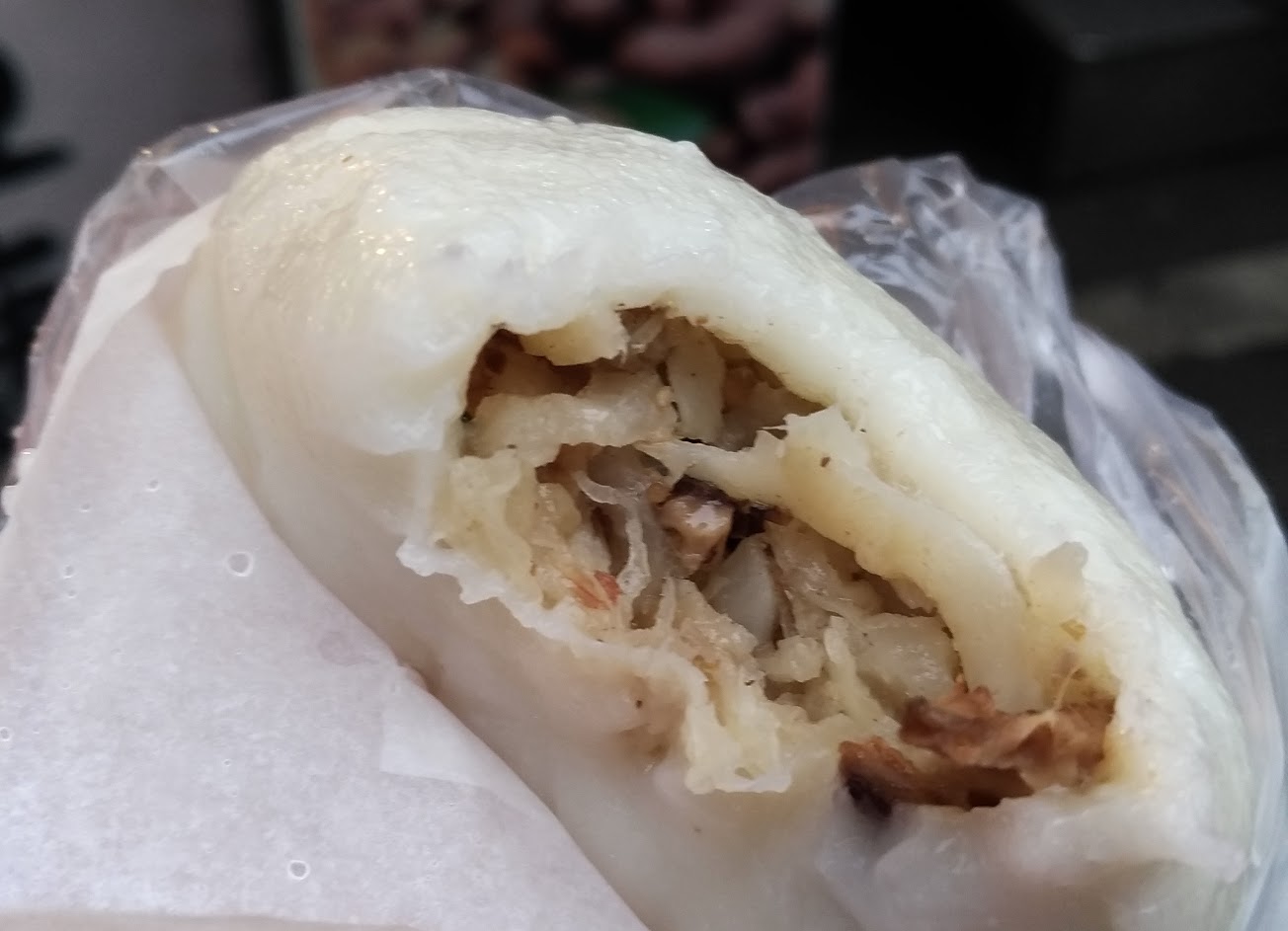 口感不是包子,應該是粿,白色原味裡面包白蘿蔔絲,餡料多,好吃? …