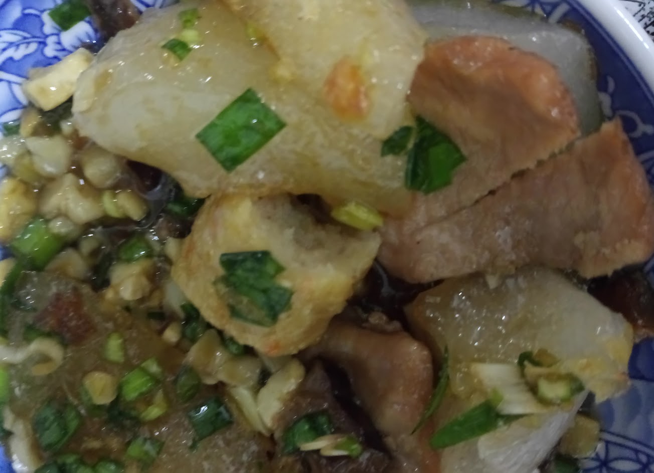 肉圓超大餡多又好吃,配上蒜苗、辣椒簡直完美,重點是不貴好吃,點2個肉圓加上古早味滿滿料的羹湯總共才90元!