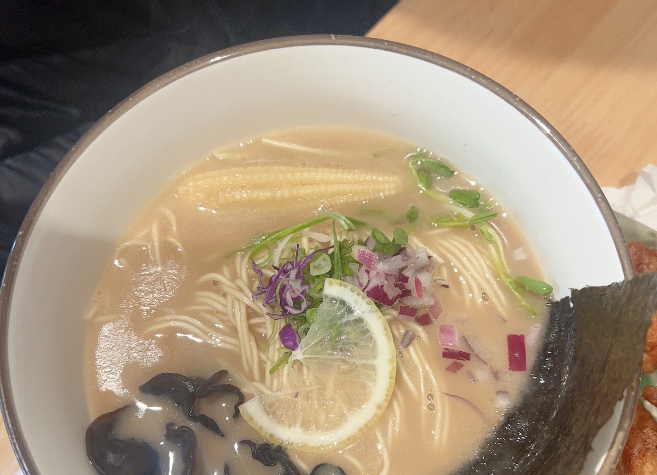 拉麵跟炸物都好吃 只是炸物旁邊的洋蔥太辣了? 還有湯裡面的玉米筍煮的有點太軟了 …