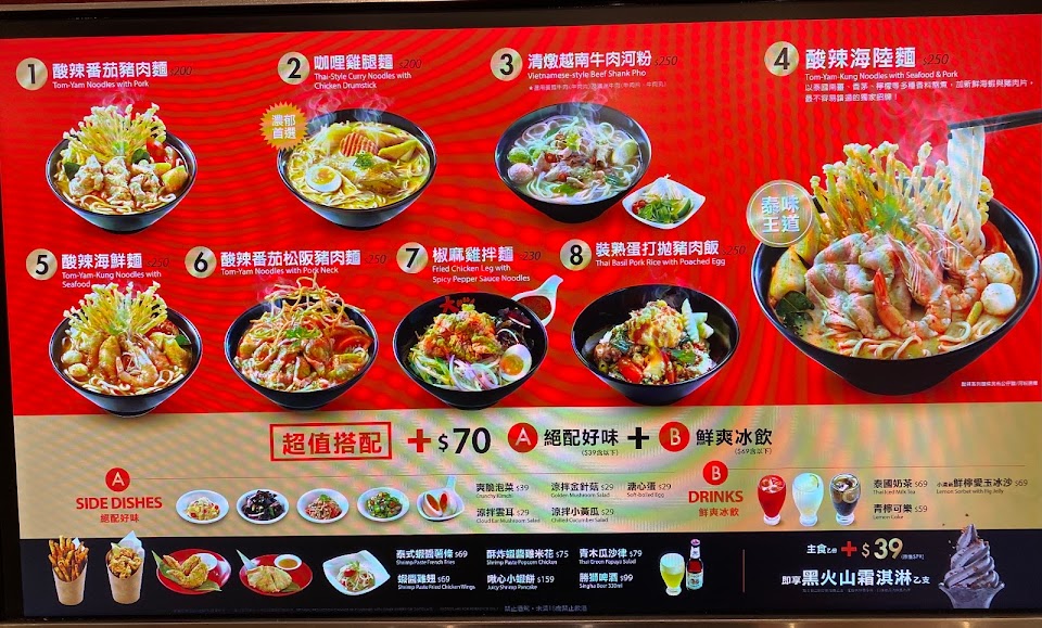 路過看到是瓦城餐飲旗下另一品牌。大心泰式。好奇心驅使下和品牌的認可進了門去踩點。嚇到我了。這自助式的方式讓我覺得我是在美食街吃東西。蠻有創意的。來泰式當然點了泰式的酸辣海鮮麵。光擺盤絕對價值260元。湯頭好喝。又點了椒麻雞拌麵。這道我是完全被辣趴了,也鹹怕了。吃完餐到公司第一件事居然是跑廁所。還是很急很急的那種。沒下次了。