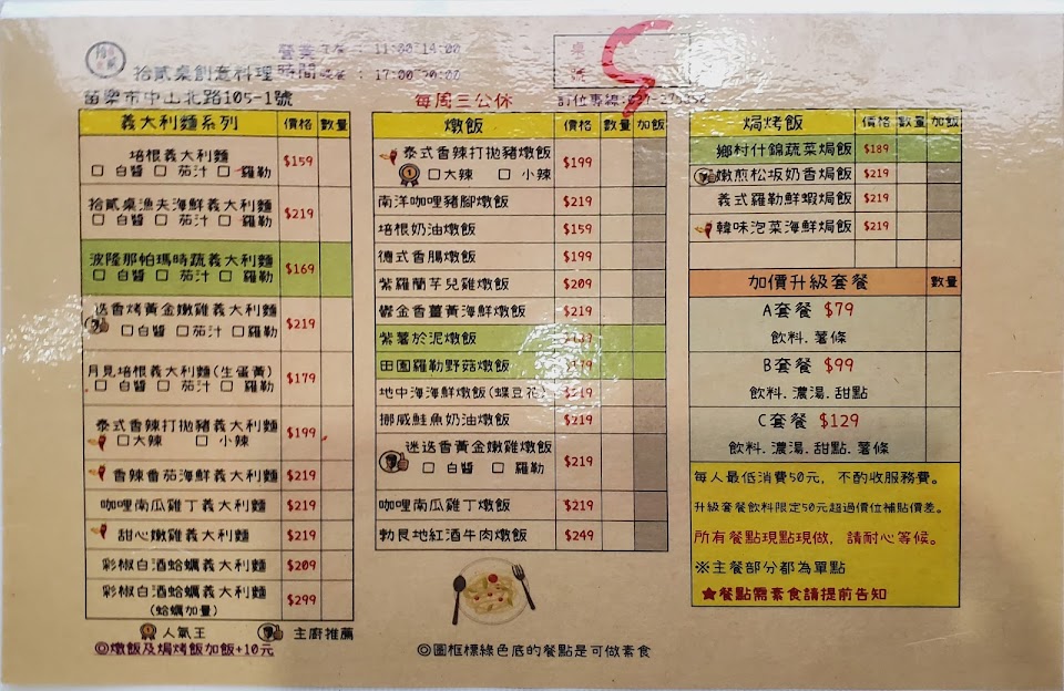 價格和一般義式餐廳差不多,約150~300之間,份量與他家相比,稍多一點。 提供義大利麵(不得挑選麵)、焗烤燉飯、點心炸物和飲品。