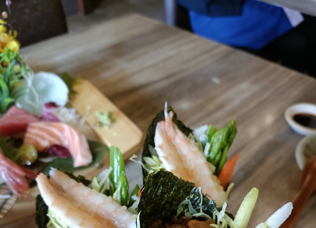 蝦蘆筍手捲, 綜合生魚片, 麻辣牛丼