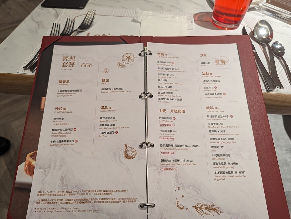 義式海鮮清湯, 焗烤法式麵包, 原塊牛排