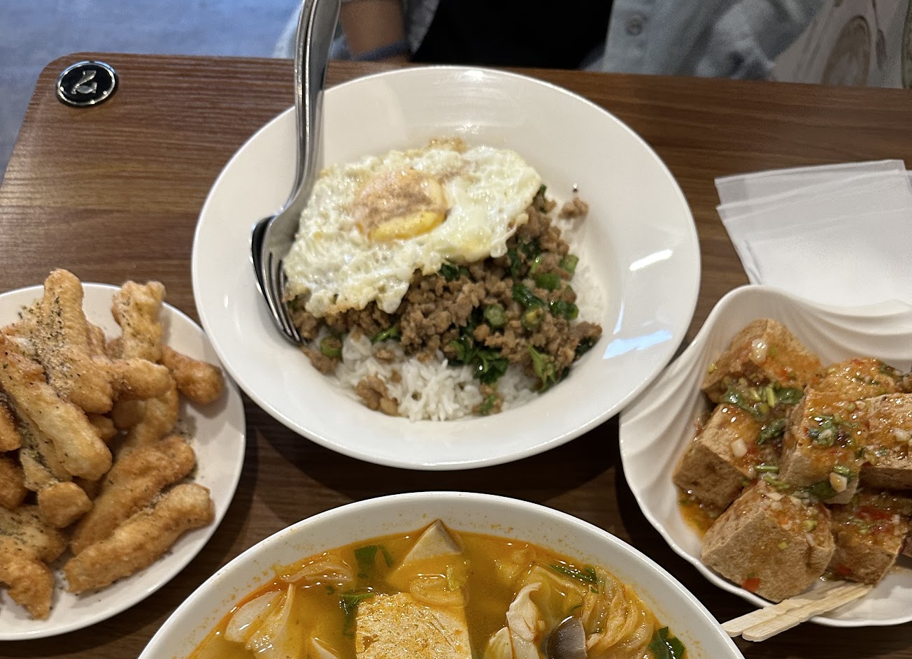 綠咖哩微辣很入味椰奶香很重超喜歡,但如果豬肉再多點口感會更好。打拋豬也是微辣、蛋可以選半熟或全熟,半熟流蛋汁超療癒~炸物都很頂??????蝦餅超讚!!!!!外脆內Q!!洋蔥圈很新鮮、炸豆腐有點像臭豆腐的口感,內部超軟嫩外皮超酥,但醬汁感覺可以再辣一點會更有味道!