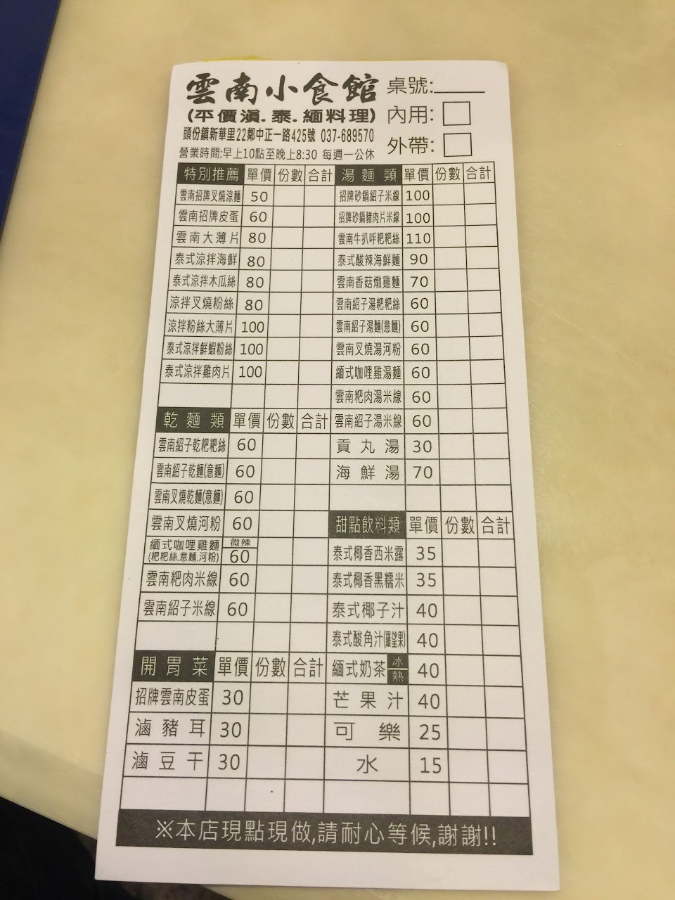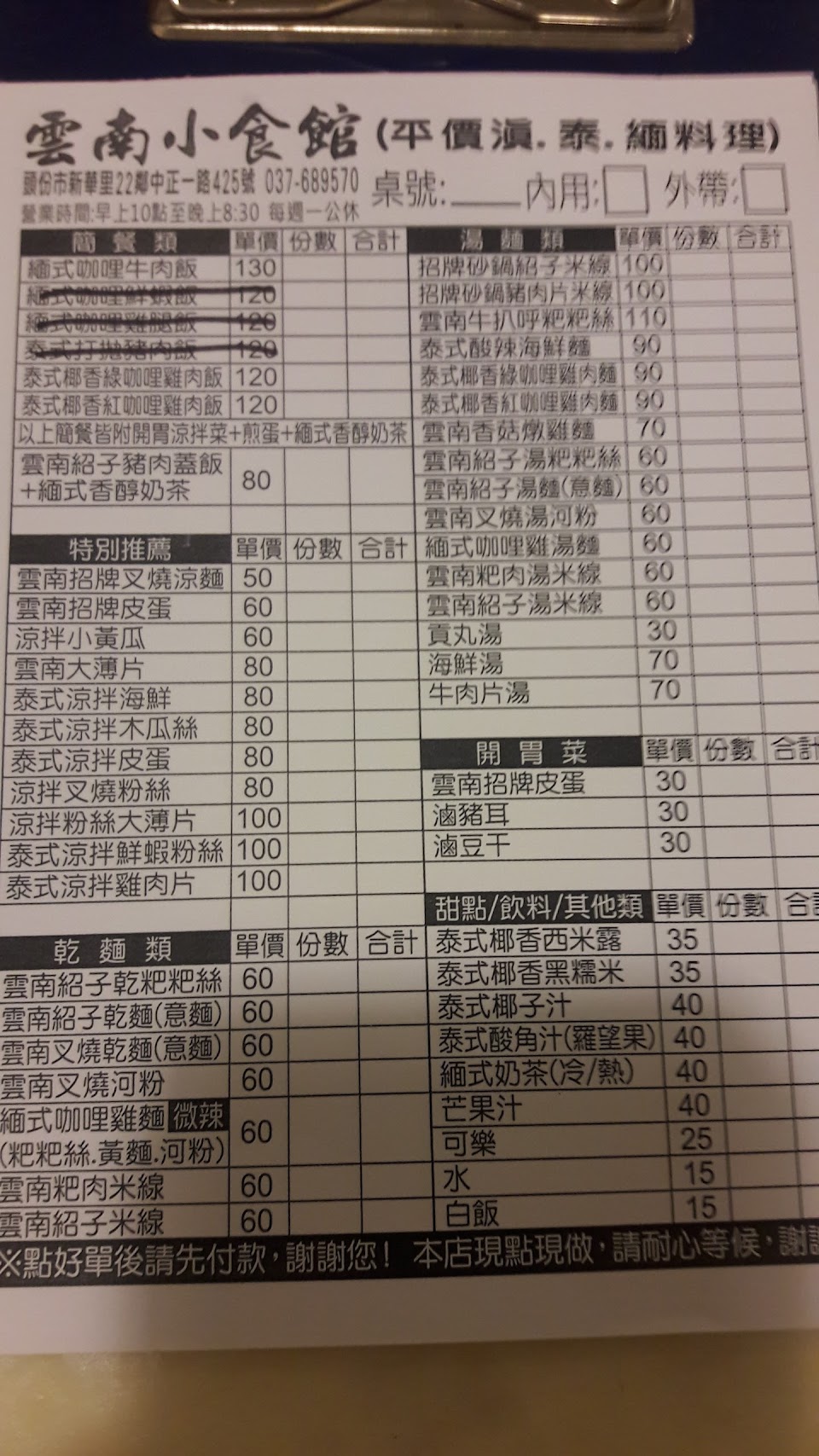 有著平常少見的雲南泰國麵甸的食物,吃膩了台灣傳統小吃,如果有經過頭份交流道時,值得進去一嚐獨特的雲泰飲食,一如以往曾去過的雲泰料理店,有很大部份的食物都有辣味,也有少部份食物是不辣的,看客人的喜好了。店內乾淨明亮,客人不會爆多,飲食環境還不錯。