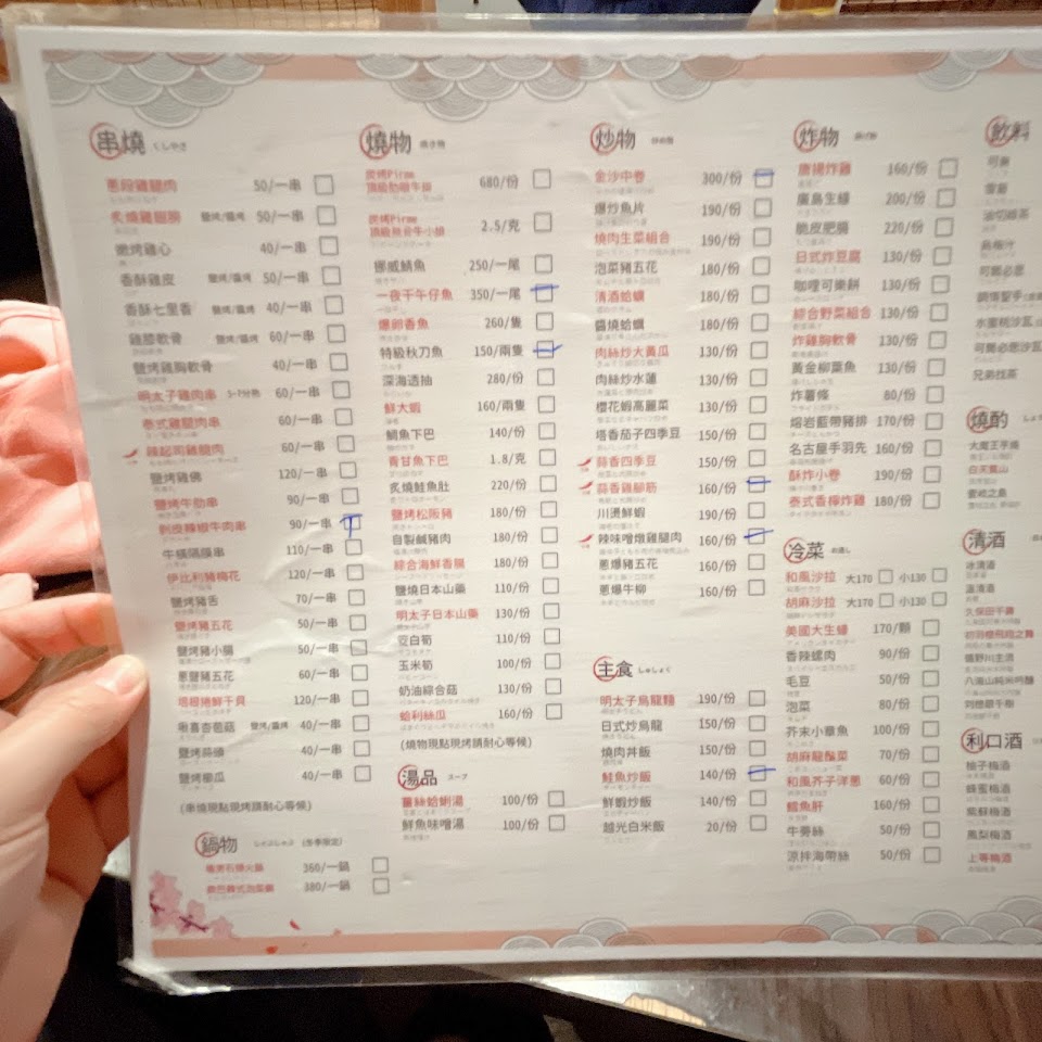 推薦 炸黃金柳葉魚, 烤香魚, 剝皮辣椒牛肉串, 金沙中卷, 櫻花蝦高麗菜, 培根捲干貝, 鮮魚味增湯