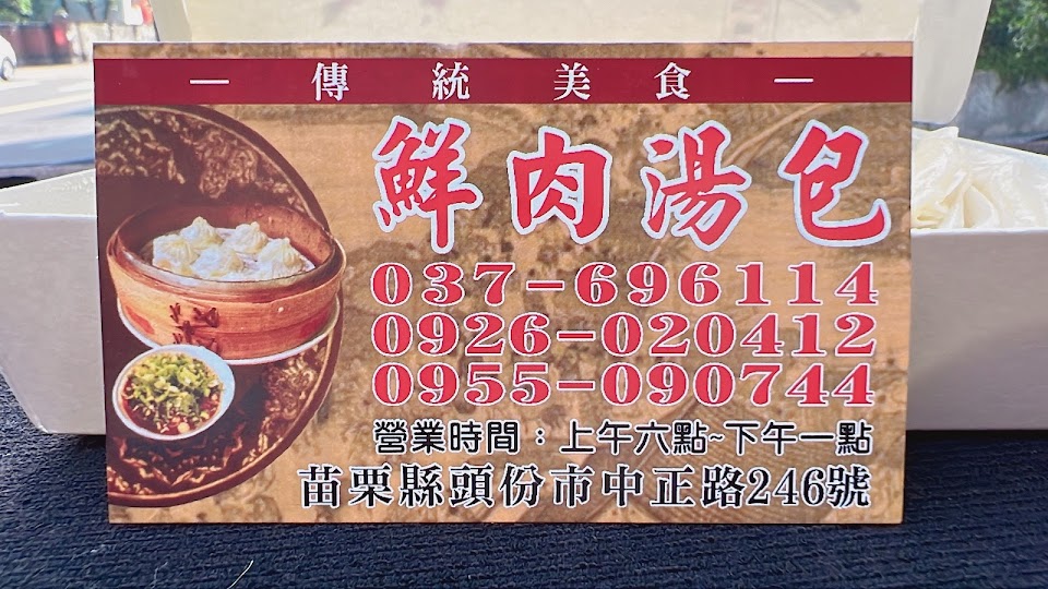 一個純樸的小鎮,一個沒有半點裝飾的店家,居然蘊含著如此巨大能量的美食,今天要介紹的是在苗栗頭份的一家鮮肉湯包店,他的名字就叫做鮮肉湯包,有點無厘頭,又帶著一點客家人勤儉持家的硬頸精神?,一進去的時候,老闆就親切的問要幾籠,他建議先點一籠來吃吃看,賣的東西很簡單,不是飲料就是湯類,一籠湯包有六顆,每一顆都像巨大的牡蠣一樣肥美無比,喜歡吃蔥的朋友,請千萬一定要在佐料台上加上大量的青蔥,我觀察旁邊的客人有兩種吃法,一種是將醬油跟辣油裝在一個碟子上,用沾著吃,另外一種吃法就是直接將醬汁淋在肥美的湯包上,咬下湯包的時候,濃郁的香氣撲鼻而來,在如此蘊含強大能量的湯包,真的感覺氣場非常強大,我姑且要很尊敬的稱呼它為進擊的湯包,因為它完全顛覆了我的味蕾,也顛覆了我對湯包的想像力,平常從早上六點賣到下午一點,我去吃的時候一開始人潮不多,後來陸續有客人進來,甚至有人來採訪,我問店家一些保存上的問題,他們都很熱心的回應,真的是非常值得一推的商家,我絕對會再來!