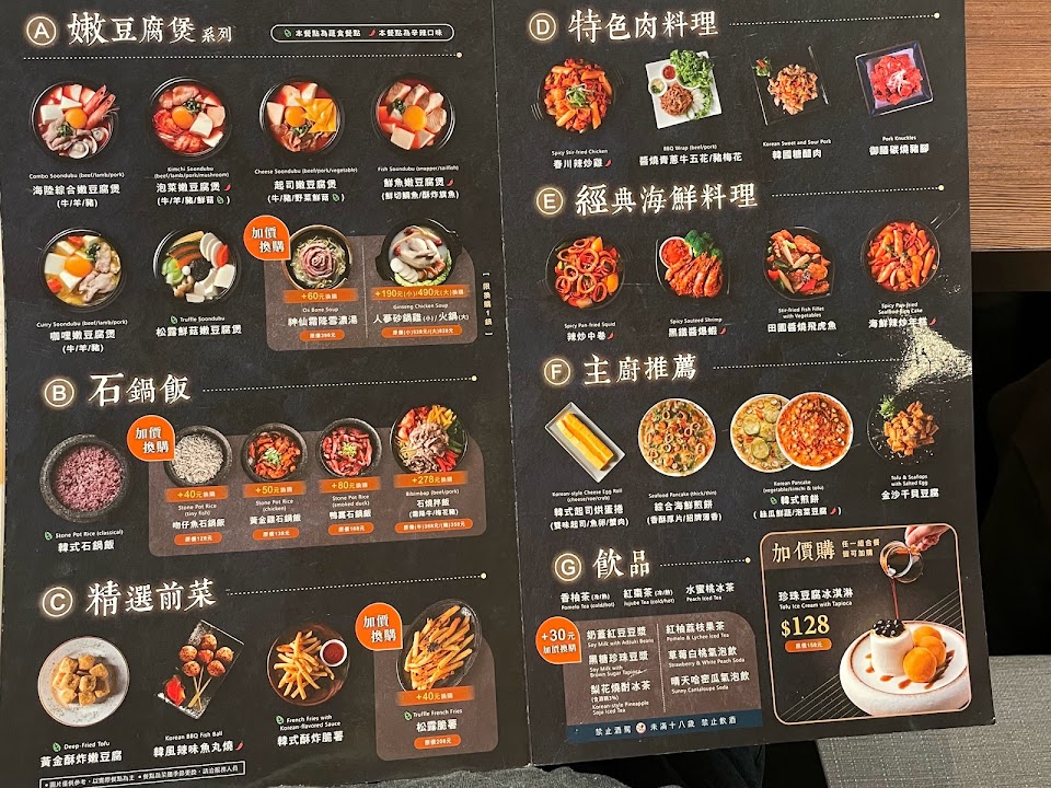 免費小菜, 花生黑糖豆花, 石鍋拌飯, 綜合海鮮煎餅, 甜點豆花