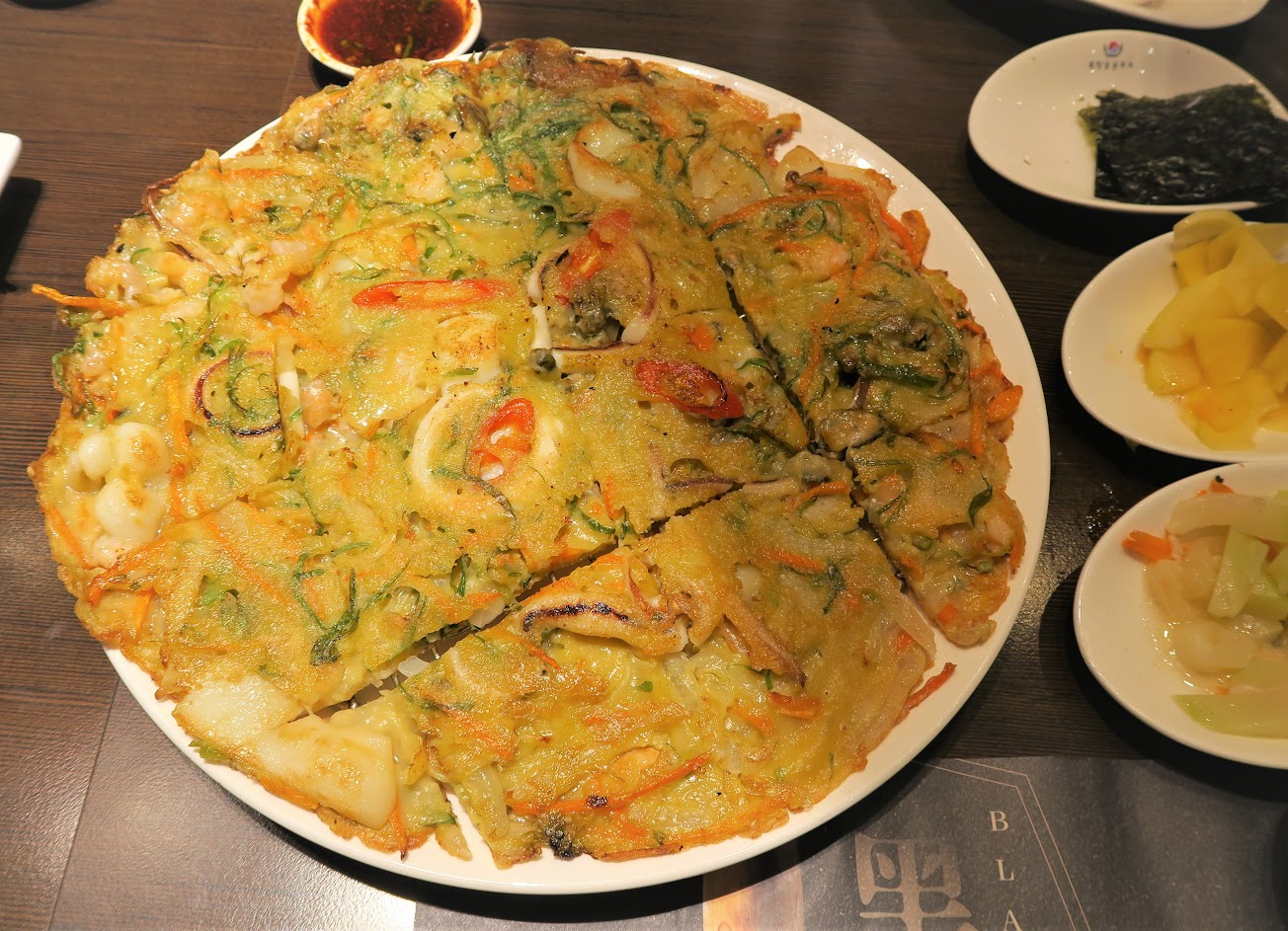 3️⃣海鮮煎餅(薄片):這道菜很可惜,外皮完全沒有酥脆,不知道是趕著上餐還是怎麼樣,雖然裡頭海鮮料給得很足,但是我想煎餅的靈魂還是酥脆的外皮。