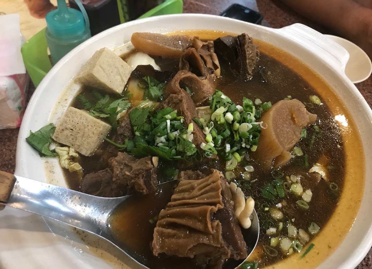 第一次來這家店,點了牛筋麵,大碗120,上來時感覺碗很大,但麵不多,湯味道淡有點不及格,湯量倒是滿多的,牛筋量不會少,但吃到後面有騷味,整體沒像評論那麼好,我給70分,或許火鍋會比較好吃吧!服務人員態度沒問題,不會因客人多就失去該有的笑容。