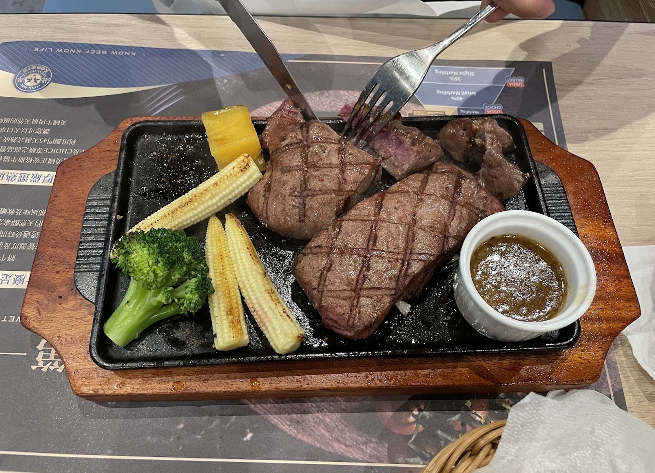 一開始我以為是肉質太硬 後來才發現應該是鐵板太燙了 等到可以食用的時候七分熟的板犍牛已經變成了全熟牛排