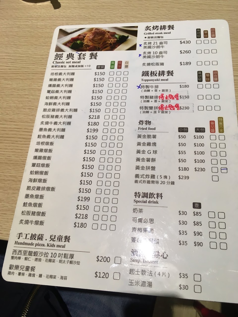 之前去吃點了”特製沙朗”排餐,雖然有心理準備是比較便宜的組合肉牛排,但是送上來幾乎整塊都是筋,沒筋的地方肉也太硬,根本切不太斷,終於切下一塊後,肉吃起來味道也怪怪的,於是花了180元,整塊肉幾乎沒動(反正也切不動)。整個很傻眼的一次用餐體驗。