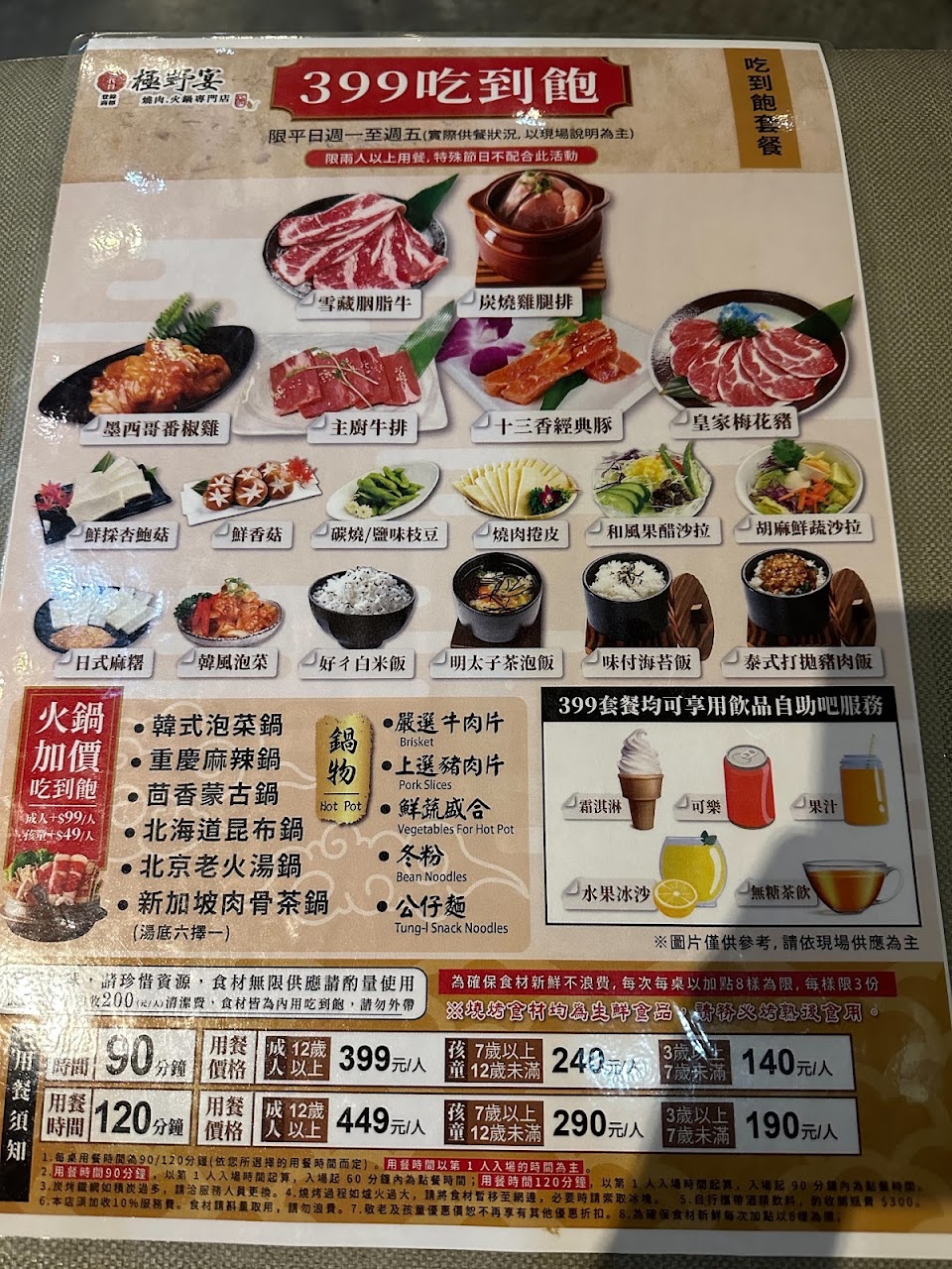 今天吃$899的價位,點餐系統10分鐘只點一輪,一次只能點八盤(一瓶啤酒也算一盤),內用點餐只能點70分鐘(七輪),六個人共用一個烤網,火鍋容量比我的泡麵碗還小,加上被提前七分鐘關系統(所以只有點六輪),根本就沒吃飽,而且還經常漏單、漏送!