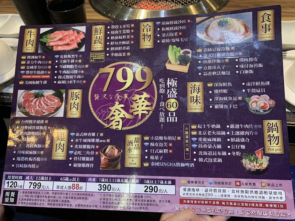 點799的吃到飽,食材感覺都不新鮮,肉片薄的像紙片,一夾就散,牛排像是剛從冷凍庫拿出來的,吃起來味道很怪,點完一次要間隔10分鐘才能再點一次,很糟的用餐體驗